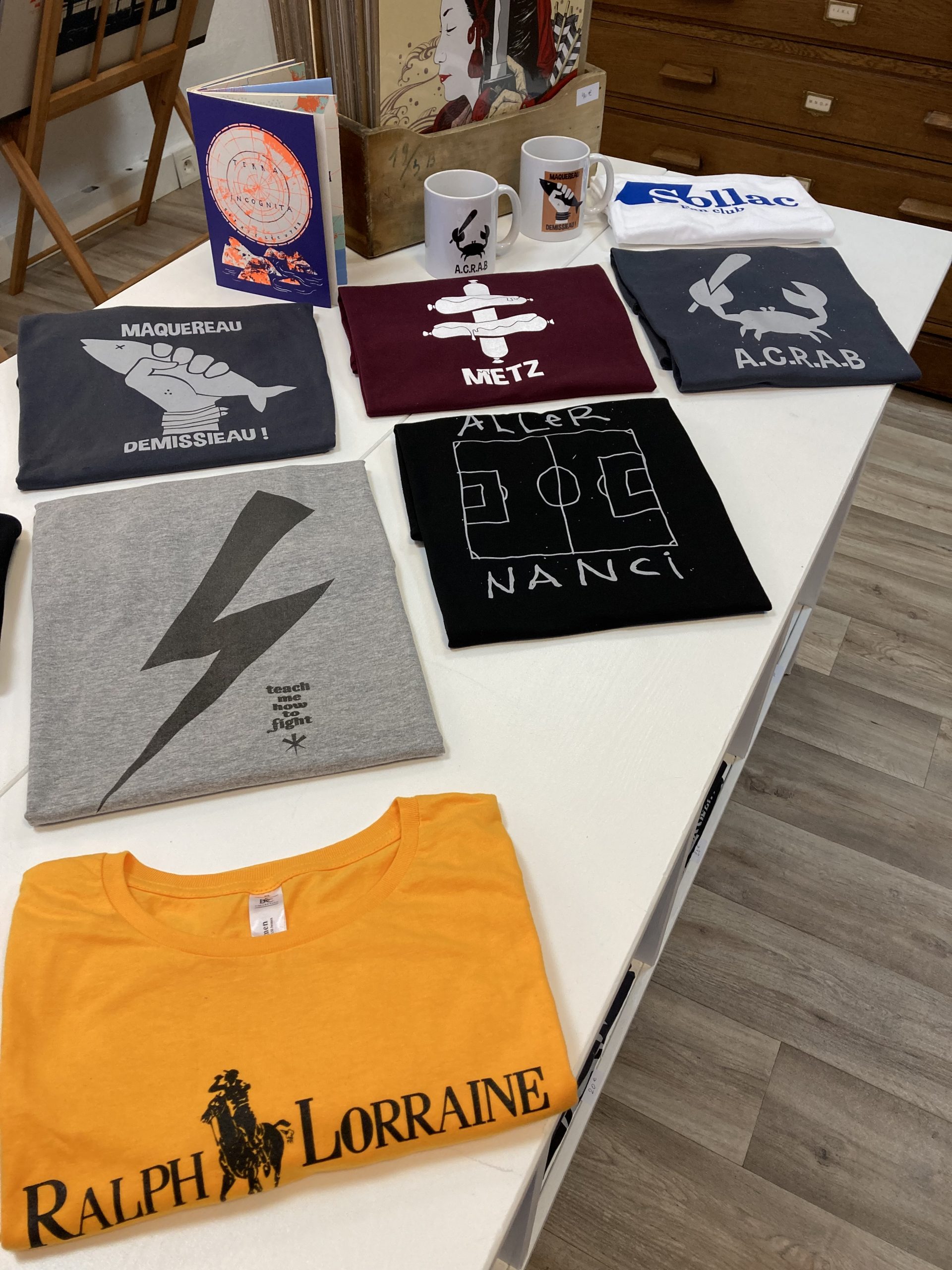 C’est un lieu qui ne ressemble à aucun autre. Un lieu qui leur ressemble. Chamarré et foutraque, quoique agencé avec ordre, avec soin. Plein de couleurs qui claquent. Plein de trouvailles, de fantaisie. De clins d’œil à l’actu, aux particularismes locaux. Qui retiennent le regard. Invitent à s’attarder. Dérouillent les zygomatiques, aussi. Des affiches, des t-shirts, des goodies. Une malle aux trésors moderne, insolente, réjouissante. Ici, on peut s’habiller en « Ralph Lorraine » ou en « Locoste ». Ici, on peut revendiquer son attachement au club de football de la ville voisine en proclamant, haut et fier, un « Aller Nanci » aussi ironique qu’irrésistible. Ici, on est très politique : « Maquereau démisseau », réclame un slogan et c’est bien la preuve que l’on ne craint pas de s’en prendre jusqu’aux gros poissons. Ici, on dépiaute et on ausculte le pangolin à l’origine – ou non – de la pandémie. Ici, on visite Metz à coups de tirages eux-mêmes revisités, et de quartier en quartier, à coups d’instantanés, on la redécouvre en négatif et tout en suggestion, la belle blonde saisie par l’œil du photographe. Ici, on laisse son imaginaire vagabonder. De sourires en étonnements. Ici, c’est ailleurs. Ici, c’est le Schmirlab, nom de baptême qui dit tout de son ancrage mosellan, implanté au début de la rue des Jardins, l’autre spot messin en matière d’artisanat, propice à toutes les aventures, pourvu qu’elles se fabriquent avec les mains…