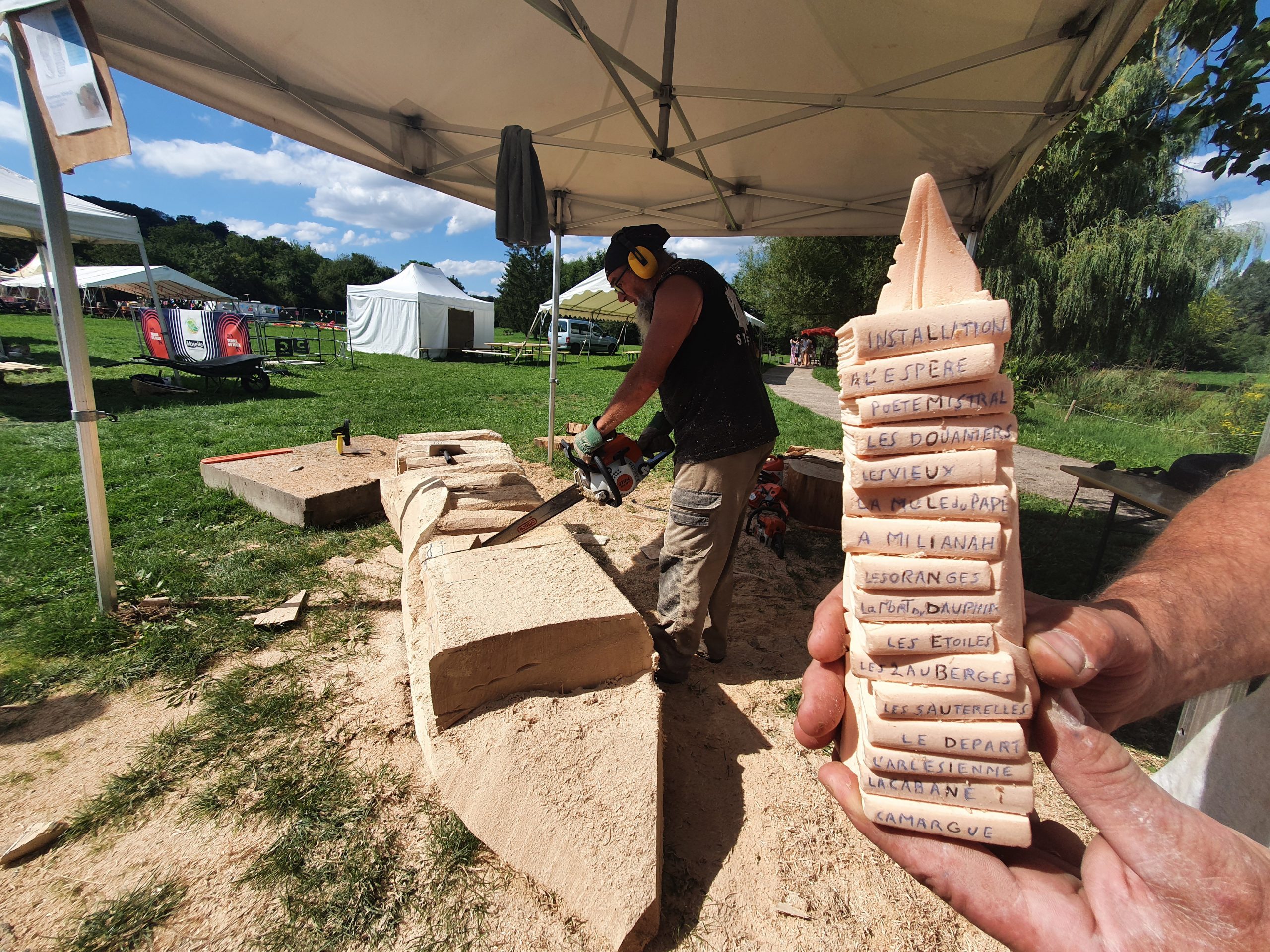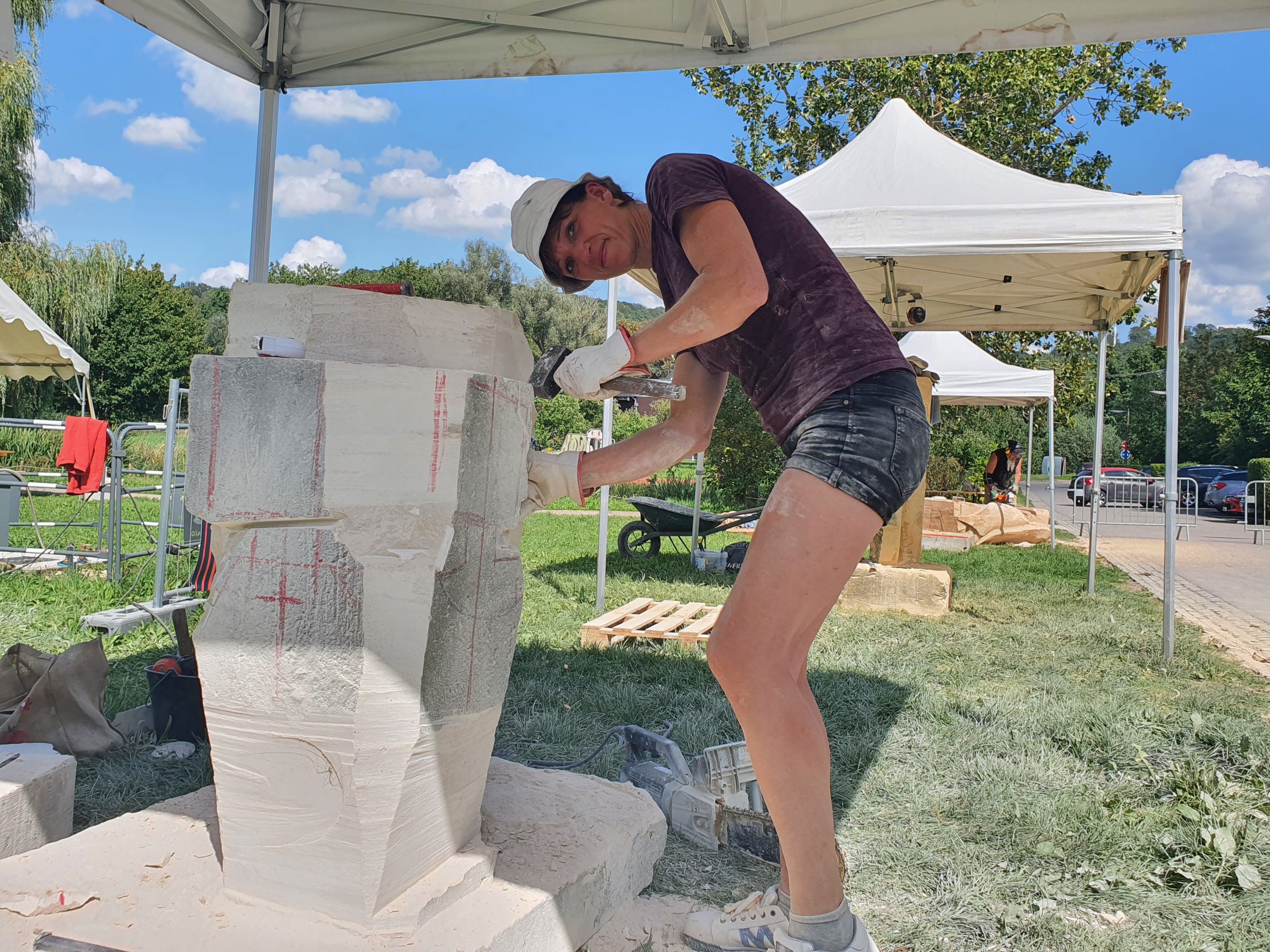 Lundi 21 août, 14h30. Les bruits des tronçonneuses s’invitent jusqu’à nos oreilles. Rien d’inhabituel vu la période, ça sent l’entretien des espaces verts. On est loin de la vérité. Les machines s’activent à dompter la matière au vu et au su de tous. Les proies du jour, un chêne de Veckring et un tilleul de Kemplich. Du pur local. Même traitement pour les pierres de Jaumont et de la Meuse choisies comme support de travail par d’autres artistes.