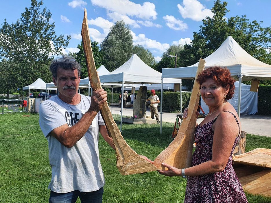 Lundi 21 août, 14h30. Les bruits des tronçonneuses s’invitent jusqu’à nos oreilles. Rien d’inhabituel vu la période, ça sent l’entretien des espaces verts. On est loin de la vérité. Les machines s’activent à dompter la matière au vu et au su de tous. Les proies du jour, un chêne de Veckring et un tilleul de Kemplich. Du pur local. Même traitement pour les pierres de Jaumont et de la Meuse choisies comme support de travail par d’autres artistes.