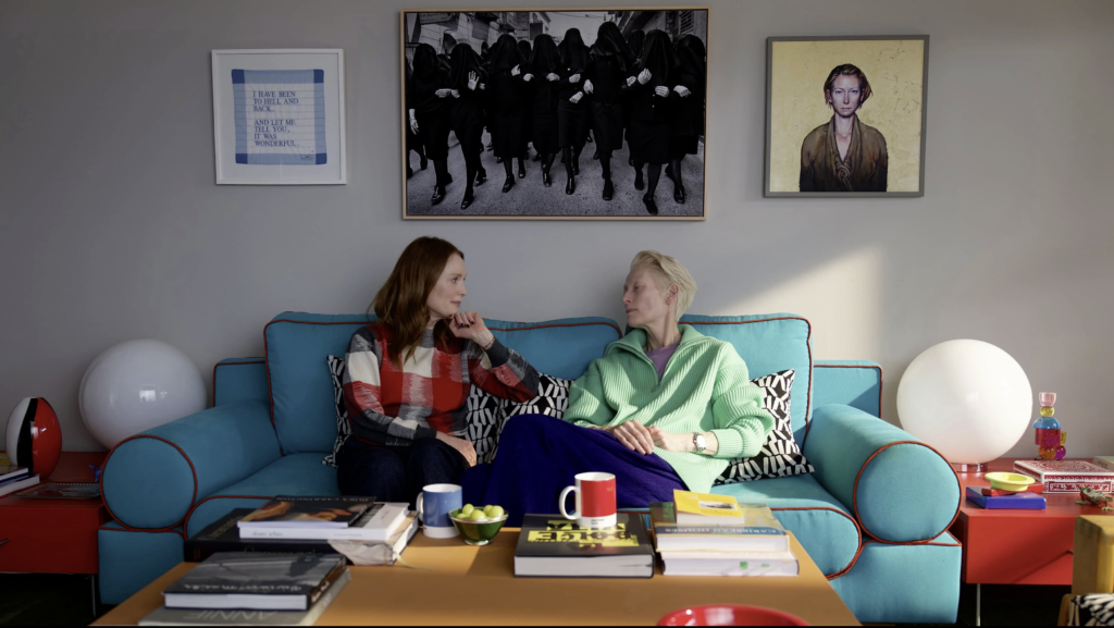 Sorti hier, le nouveau film de l’Espagnol Pedro Almodóvar est parti, selon toute vraisemblance, pour faire un évident carton côté box-office. Le cinéaste qui est capable du pire (Kika en 1994 ou Les Amants passagers en 2013) et du meilleur (Tout sur sur ma mère en 1999 ou Douleur et gloire en 2019) jouit toujours d’un empathique buzz. Or, La Chambre d’à côté, partiellement tourné en langue étatsunienne du côté de New York et pour quelques séquences sylvestres en Espagne, nous a plu en mal comme diraient les Québecois. Dès les premières séquences, on est touché par la mélancolie qui nimbe Martha (Julianne Moore) et Ingrid (Tilda Swinton), deux amies new-yorkaises de longue date. Martha est écrivaine de best-sellers, affranchie de tout et ouverte à tous les défis. Ingrid est reporter de guerre, atteinte d’un incurable cancer et mère mal aimante d’une fille délaissée. Elle a décidé de mettre fin à ses jours. Lorsque Martha revient vers elle, elle lui propose d’habiter la « chambre d’à côté » dans sa forestière résidence secondaire pour mieux vivre sa mort, neutraliser la scène euthanasique et dérouter les probables enquêteurs. L’intrigue plus mélo façon Douglas Sirk que simplement hitchcockienne se dénoue sans heurt, mortifiée par l’esthétique almodovarienne (couleurs vivaces, filmage ciselé) et oblitérée par des questions sociétales d’aujourd’hui (dérèglement climatique, fin de vie, masculinisme). L’émotion n’est pas au rendez-vous. Quant à Tilda Swinton et Julianne Moore, elles sont figées dans leur glaciale stature de stars « arty » XXL.