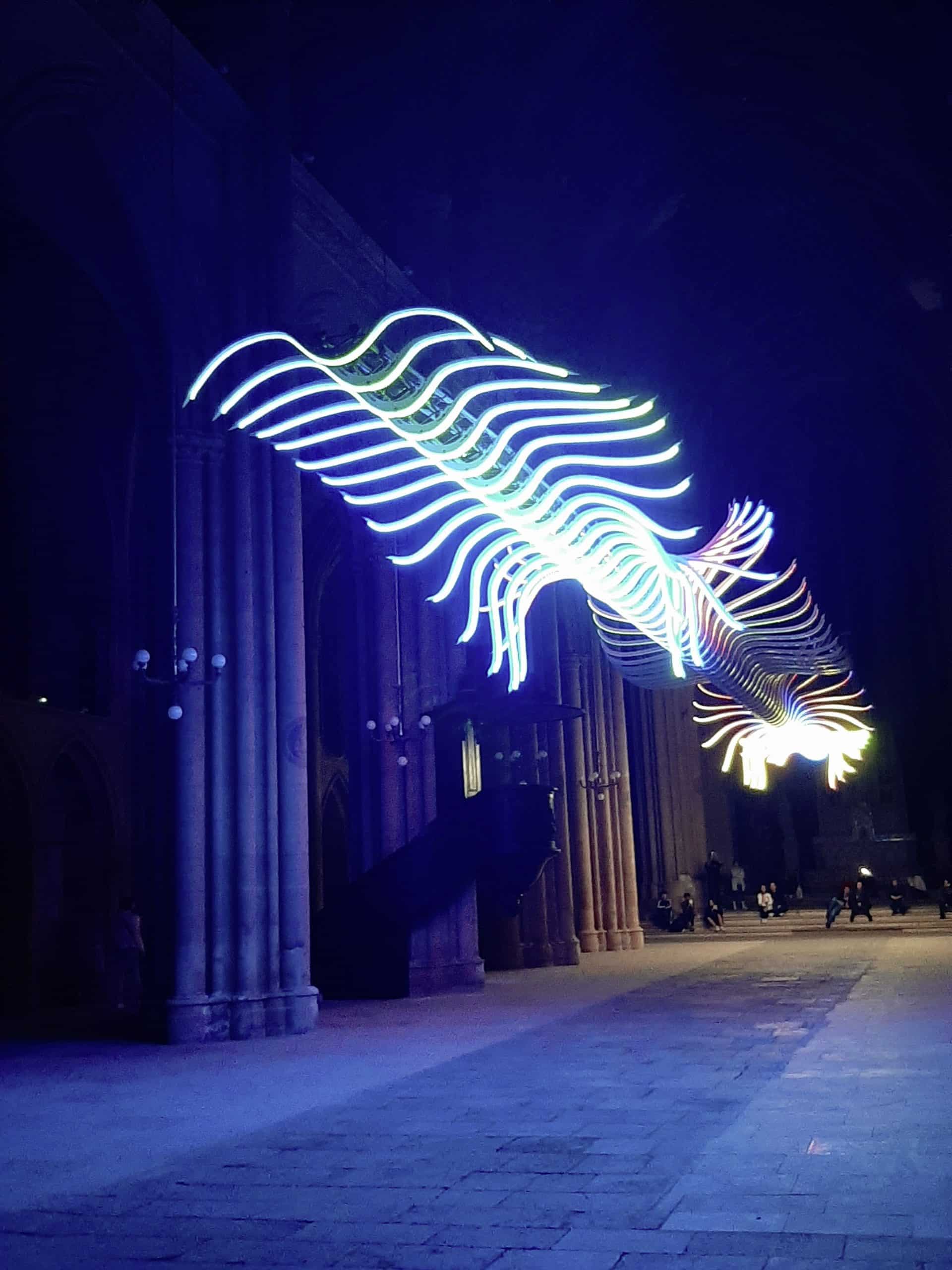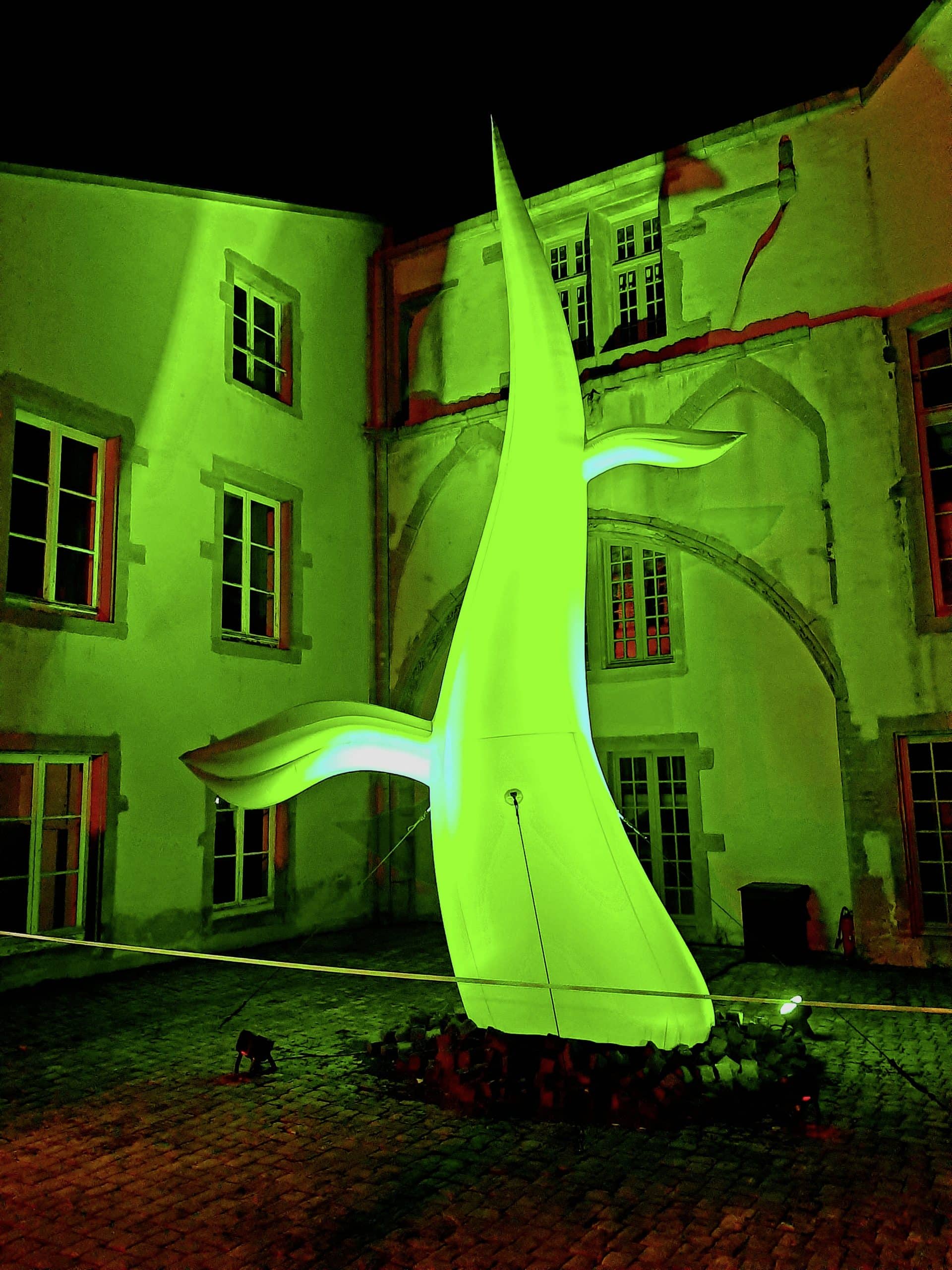 2. L’œuvre Un oiseau de passage de Benjamin Nesme et Marc Sicard raconte l’histoire d’un voyage migratoire impacté par l’action de l’homme sur son environnement. Cette sculpture imposante située au sein de la Basilique Saint-Vincent porte un message écologique clair : alerter le public sur la disparition progressive des oiseaux dans l’espace urbain. L’histoire racontée par ces jeux de lumières et ces battements d’ailes se termine avec une musique sombre et le dernier chant de cet oiseau migrateur.