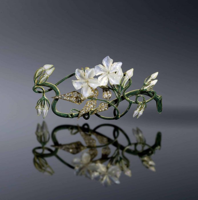 Avant-gardiste et novateur car, comme l’écrivait Henri Clouzot, journaliste et ancien conservateur de la Bibliothèque Forney puis du musée Galliera, il « réhabilita les modestes pierres jusque-là dédaignées, corindon, onyx et sardoines, jades agates et cornalines, jaspes coraux et opales » pour en faire les pièces maîtresses de ses créations. Il travaille également le verre, l’émail, le cuir, la corne, la nacre, des matériaux peu utilisés pour la bijouterie à cette époque. Un parti pris qui reflète parfaitement l’état d’esprit de l’artiste, préférant la recherche du beau à l’affichage du luxe. Un esprit visionnaire qui lui aura valu un démarrage difficile. Si au début ses créations sont boudées, de nombreuses femmes de la noblesse, de la bourgeoisie et du spectacle, à l’image de la tragédienne Sarah Bernhardt, se sont mises à porter ses bijoux. L’exposition universelle de 1900, au cours de laquelle un pavillon lui est dédié, assure sa consécration. « Le titre de l’exposition, quant à lui, est une citation d’Emile Gallé, autre grand nom de l’Art nouveau, quisaluait le génie créatif de Lalique dès 1897. Ses contemporains en effet ne s’y sont pas trompés et ont quasi unanimement mis en exergue son talent, en témoignent les nombreuses références à des critiques d’Art », conclut Véronique Brumm-Schaich. Aujourd’hui, René Lalique fait partie des grands noms incontestés de l’univers de la joaillerie. Un voyage dans le temps, dans le jardin imaginaire de cet artiste en avance sur son temps.