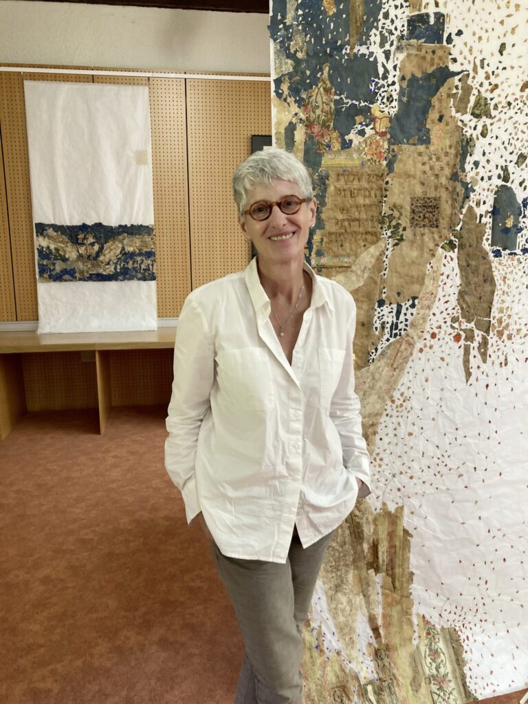 « L’idée des œuvres palimpsestes est née un peu par hasard. Elle est le fruit d’une découverte que nous avons faite, mon mari Vincent et moi, chez nous. Nous sommes tombés sur de très vieilles tapisseries et papier-peints, du 18e pour le plus anciens. Ils étaient collés par couches superposées sur certains panneaux dans la maison. Je me suis donc lancée dans la confection de palimpsestes à partir de ces tapisseries. Au même moment, Désirée Mayer, présidente des JECJ-Lorraine et avec qui j’avais déjà eu l’occasion de collaborer, me contacte pour me proposer de participer à une des deux expositions programmées pour l’occasion. Nous avons proposées que les palimpsestes viennent en regard, en écho avec les thématiques de mémoire des expositions existantes. J’ai donc réalisé une série de palimpsestes sur papier de soie, mêlant ces tapisseries avec des fragments de textes de lois révolutionnaires et des passages bibliques.