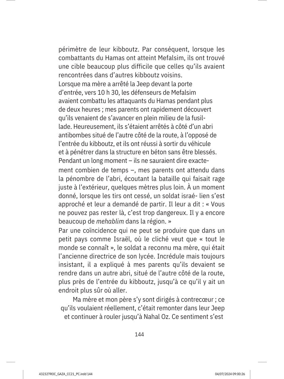 Le 7 octobre à 6h29, au premier obus tiré sur leur kibboutz, Amir Tibon, sa femme et leurs deux filles (2 ans et 3 ans et demi), se sont précipités dans la pièce sécurisée de leur maison de Nahal Oz, à 700m de la frontière avec Gaza. Pendant des heures, dans le noir et sans manger, ils ont suivi sporadiquement les événements, loin d’imaginer la puissance de l’attaque du Hamas et les horreurs auxquels se livraient ses brigades. Journaliste à Haaretz, Amir Tibon a, depuis, enquêté sur le déroulement des faits, les massacres effroyables, le scénario inexistant d’un assaut de ce genre, les manquements des services de renseignements et l’inaction du gouvernement envers les victimes. Il livre un témoignage parfois insoutenable, racontant l’angoisse des familles, terrées dix heures durant, dans des abris prévus pour protéger des roquettes, mais pas des AK-47 s’acharnant sur les portes.