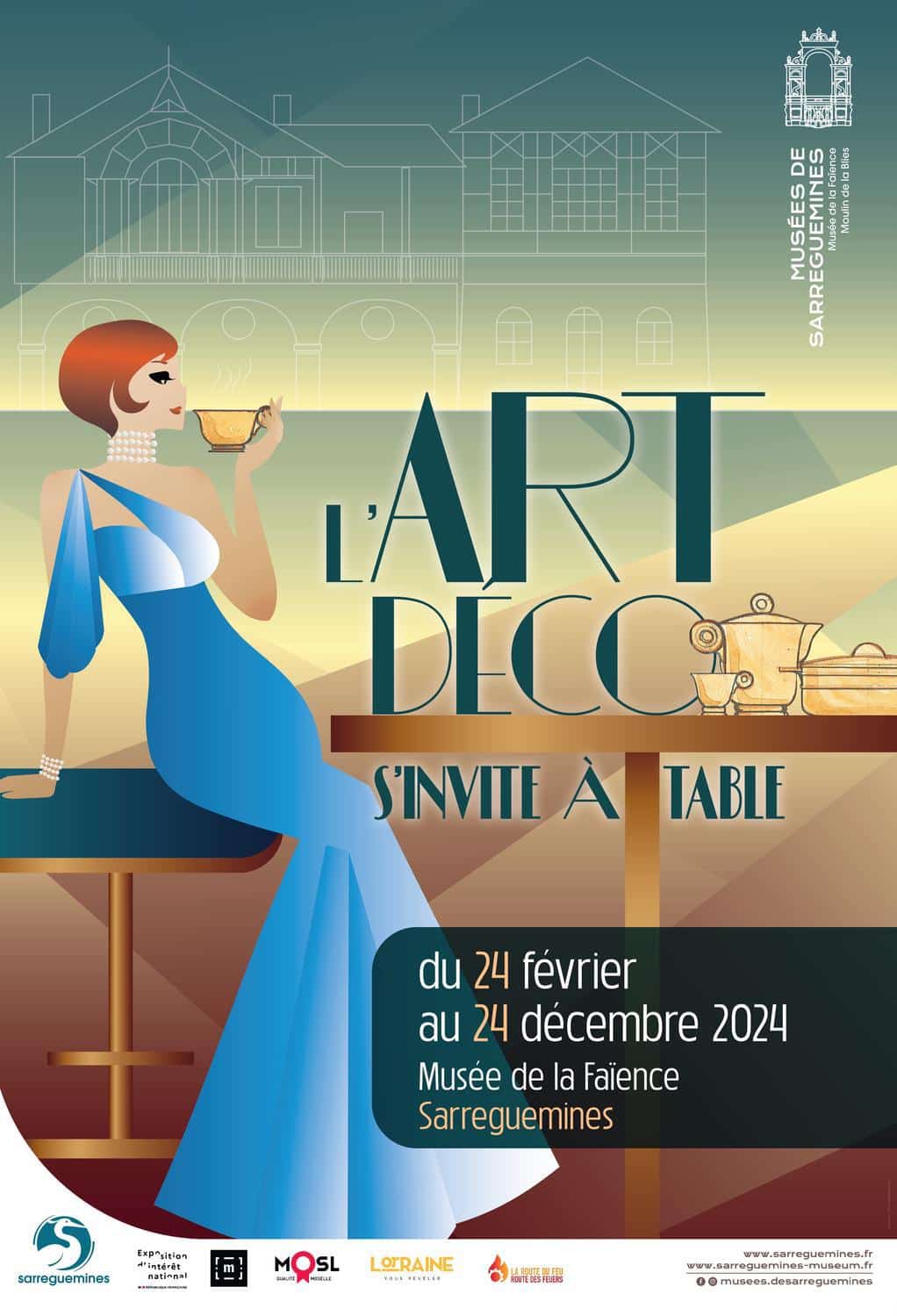 Affiche « L’Art Déco s’invite à table », Sarreguemines 2024Jusqu’au 24 décembre, le Musée de la Faïence présente l’exposition « L’art déco s’invite à table ». Elle bénéficie du label « Exposition d’intérêt national ».