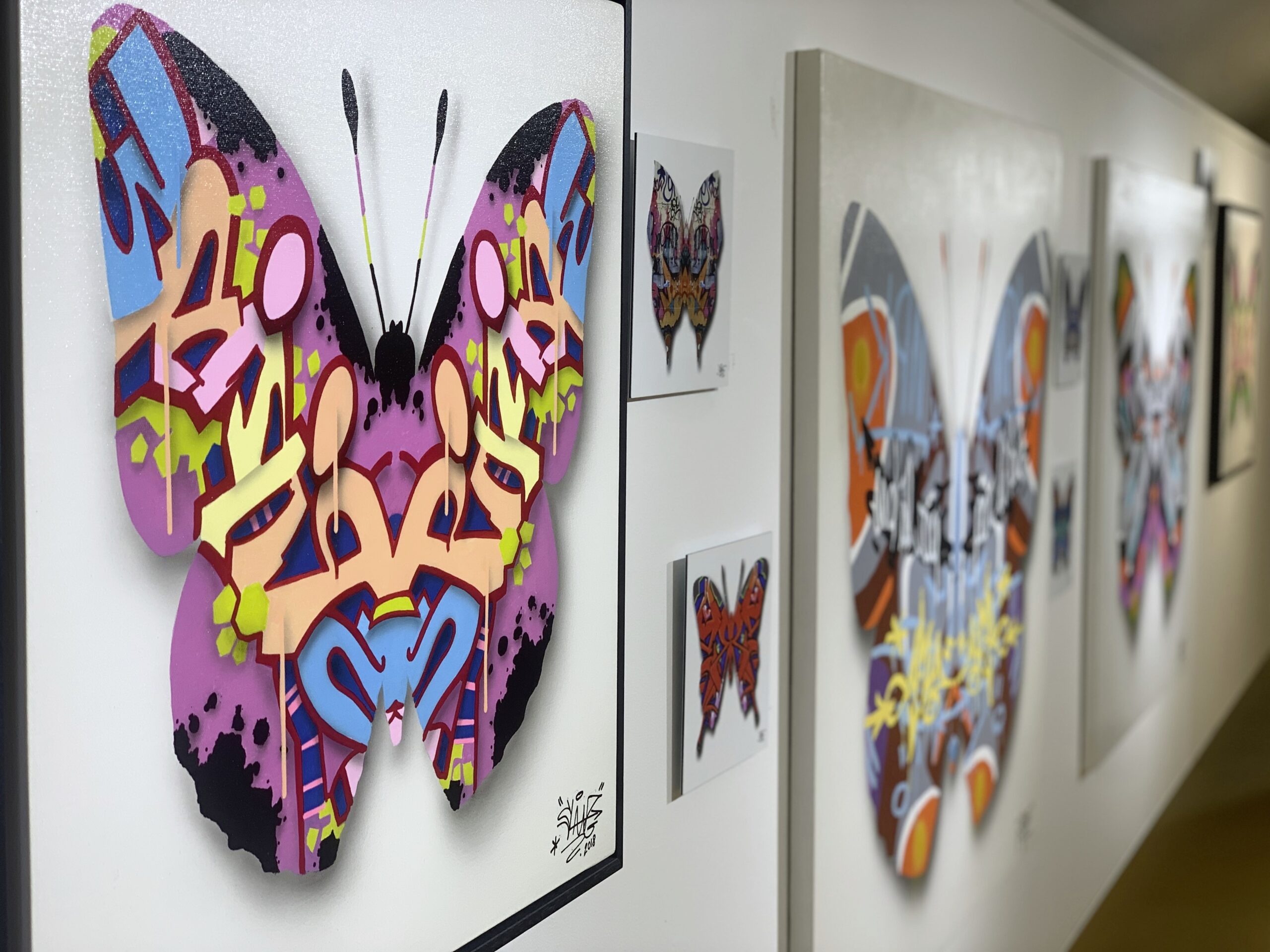 « C’est intéressant, car je redéfinis une nouvelle fois ma façon de faire de la peinture qui a été mon premier mode d’expression artistique, explique l’artiste. Sur une pièce particulièrement créée pour cette exposition, j’ai choisi de rendre hommage une nouvelle fois au passé. En tant que Nancéen, j’avais déjà fait ça pour Émile Priant ou Georges de La Tour, dont j’ai animé certains tableaux, Cette fois-ci, j’ai créé un paravent aux motifs qui s’inspirent largement des ferronneries Art nouveau et des marquises du métro parisien. » Une autre partie de l’exposition fait la part belle à une faune magnifiée: « J’ai choisi quelques animaux qui selon moi ont de la classe, le guépard ou la panthère. Je leur ajoute un collier de pertes et ça sublime leur grâce naturelle », détaille le peintre, sur des papillons géants, il reproduit des traces de peintures issues de graffitis retravaillés par ordinateur.