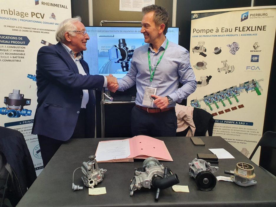 Maurice Grunwald et Emmanuel Carles ont profité de leur présence commune sur le Salon à l’Envers, à Thionville, pour sceller leur partenariat. Photo La SemaineL’entreprise Pierburg Pump Technology lance une étude visant à imaginer un système qui faciliterait le travail de ses salariés sur l’une de ses lignes de production. Elle s’est associée avec le Fonds de dotation Mercy pour financer ce projet.