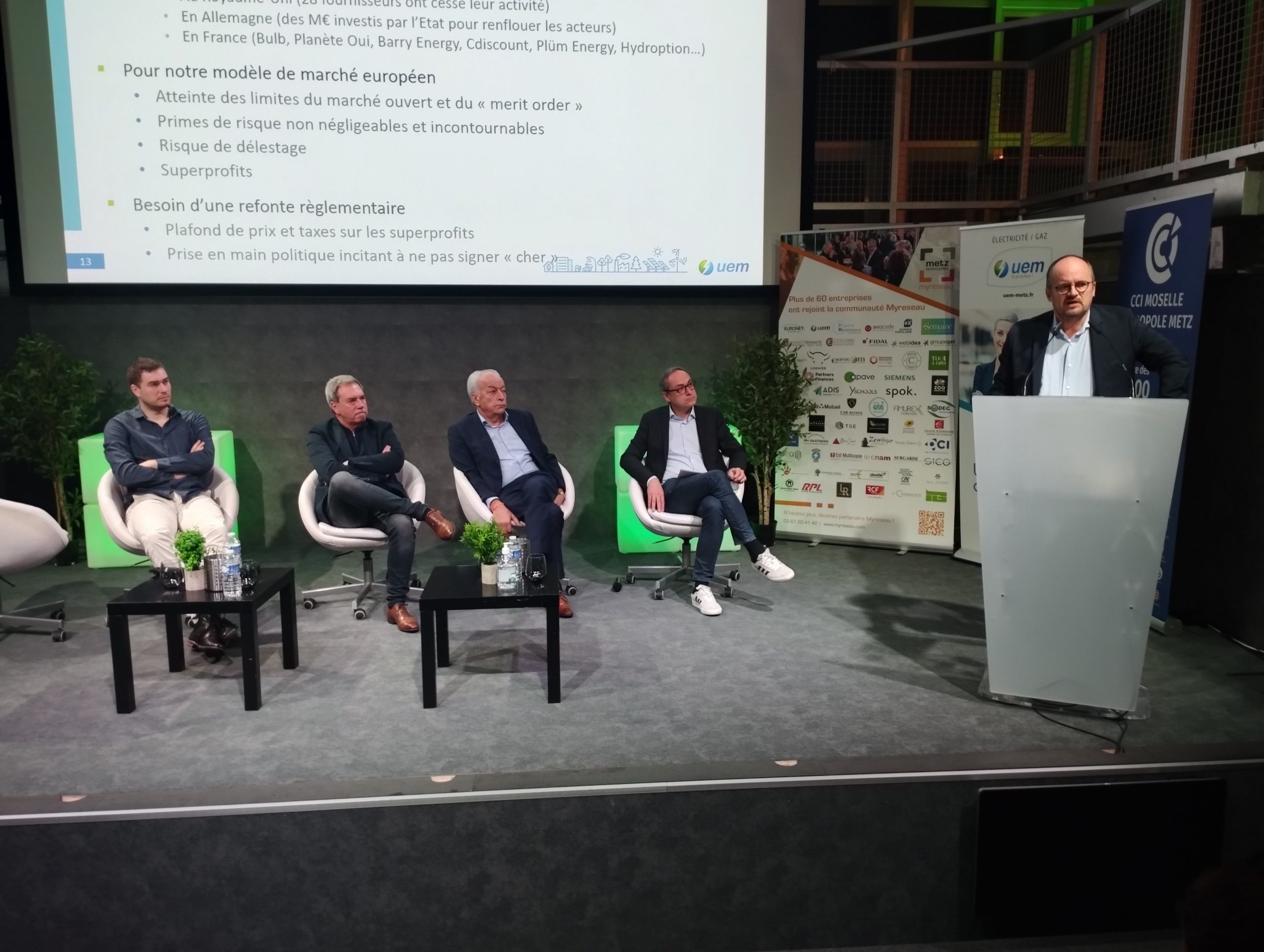 « Énorme ! » s’exclame une voix dans la salle lorsqu’est abordée la question de l’explosion des prix de l’électricité. Mercredi 19 octobre, au Cescom de Metz, une Matinale de l’économie sur la crise énergétique était organisée, en collaboration avec La Semaine. Reprise post-Covid, guerre en Ukraine, problème de disponibilité des centrales nucléaires… les causes sont connues et expliquent comment le marché de l’électricité a pu devenir aussi volatil. Fin août, record absolu : le prix du MWh culmine à 1 130 euros avant d’enregistrer une baisse de moitié dix jours plus tard. Avec ces fluctuations, difficile de s’y retrouver. « Le système est KO debout. Sans l’intervention des États, des politiques, l’ordre ne reviendra pas », affirme Stéphane Kilbertus, directeur général de l’UEM. Ambiance. « On ne sait plus comment avancer », réagit Fabrice Genter, président de la CCI Moselle Métropole Metz, alors que le président Emmanuel Macron a invité les entreprises à ne pas signer leurs contrats d’électricité si vite et a promis des décisions à l’échelle européenne. « Je conseille aux entreprises d’attendre les décisions européennes espérées début novembre avant de retenir une offre car les aides qui pourraient être décidées ne seraient sans doute pas rétroactives. Les entreprises devront aussi être capables de valider un contrat en une demi-heure car les prix peuvent changer d’une minute à l’autre », commente le dirigeant de l’UEM.