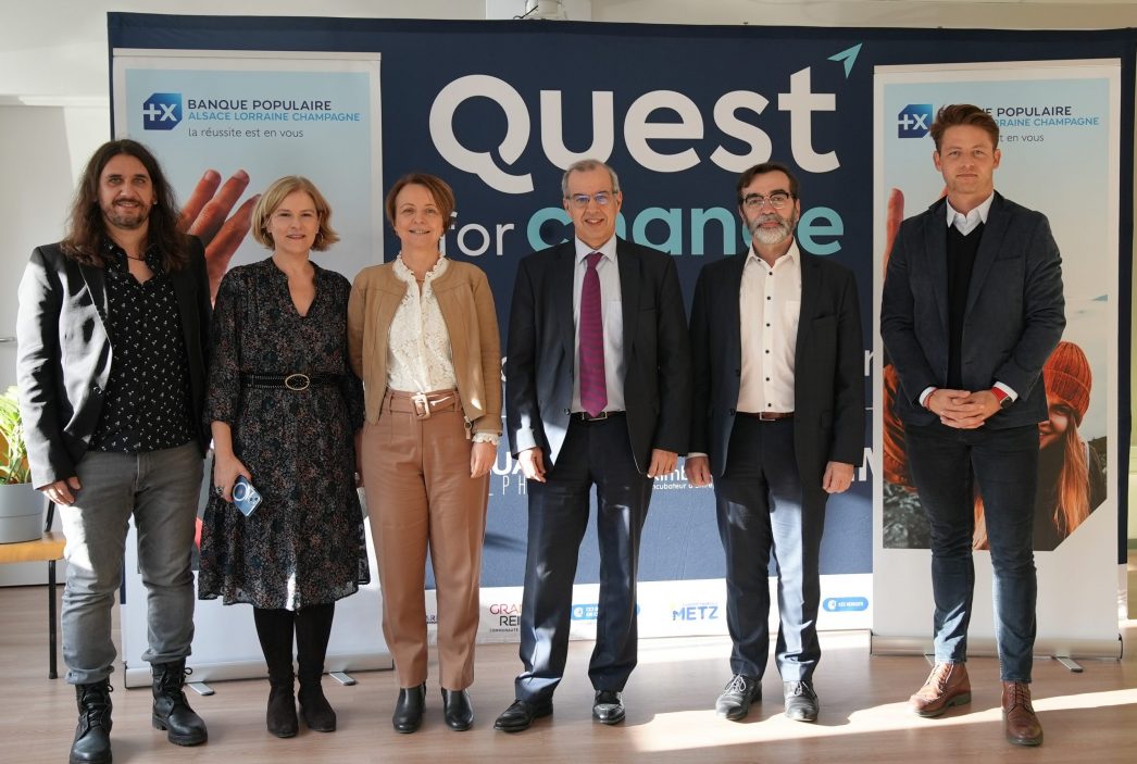 Stéphane Chauffriat, Directeur de Quest for change, Mireille Wetz, Chargée de Mission Innovations et Startups BPALC, Natacha Schreiber, Directrice Commerciale BPALC, Aimé Added, Directeur Général Adjoint BPALC, Pascal Neuville, Président de Quest for change, Sébastien Carraro, Business Manager SEMIA, Entreprise & Mécénat Quest for change. Photo DRAvec Quest for change, le réseau d’incubateurs du Grand Est, la BPALC vient de signer une convention de partenariat pour développer une plateforme qui favorisera les échanges entre start-up.