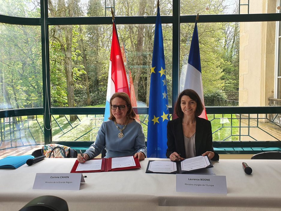 Corinne Cahen (à gauche) et Laurence Boone ont convenu de plusieurs projets communs entre le Luxembourg et la France. Photo La Semaine Le Domaine de Volkrange, situé à Thionville, a accueilli lundi 17 avril la 7e commission intergouvernementale franco-luxembourgeoise. Une rencontre qui a permis d’acter de nouvelles avancées en matière de mobilité, de sécurité, de santé et de formation, afin d’améliorer le quotidien des habitants frontaliers.