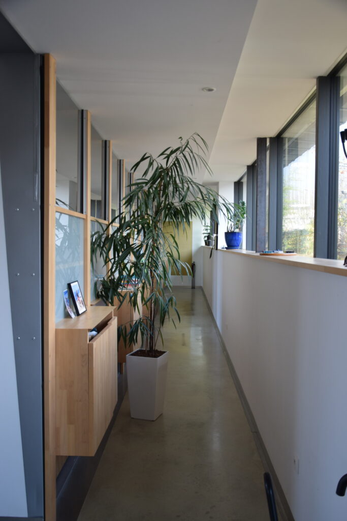 Rolf Matz s’est illustré tout au long de sa carrière d’architecte par sa spécialisation dans la conception bioclimatique et la physique des bâtiments. Pionnier des constructions passives en France, c’est en Allemagne qu’il est allé se former : « Au-delà de la performance énergétique qui est aujourd’hui un enjeu social, j’insiste beaucoup plus sur la notion de confort. Peu d’humidité dans l’air, pas de chocs thermiques. Quand on s’approche ici des baies vitrées au triple vitrage, on ne ressent pas ce froid habituel. Même l’acoustique est importante pour se sentir à l’aise. On entend à peine les enfants qui jouent dans la cour d’école juste à côté. Ça m’amuse et ça ajoute à l’identité des lieux. » Une maison exemplaire qui possède une âme, celle d’une ancienne école. La mère de Rolf Matz, ancienne institutrice, ne s’y est pas trompée : « La première fois qu’elle a visité la maison, elle a fondu en larmes replongeant des années auparavant dans l’école en Moselle – identique à celle-là – où elle avait fait ses premières années en tant qu’institutrice. »