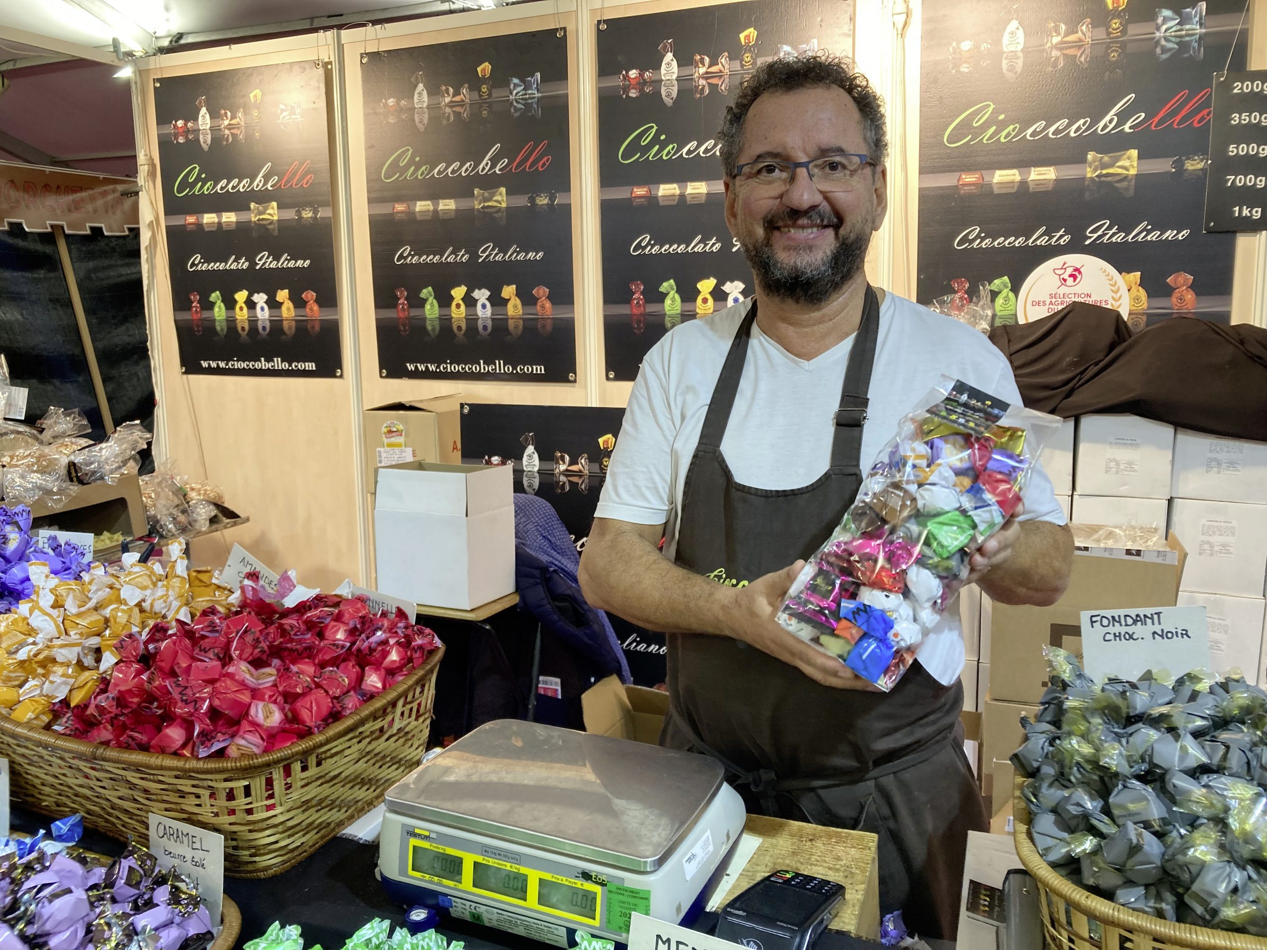 Quelques mètres plus loin, Jacques vend des chocolats pour la maison Cioccobello. Noisette, gianduja, caramel, fruits rouges, pistache, cappuccino, cannelle ou encore Limoncello, liqueur de café, amaretto… La liste des saveurs s’allonge à vue d’œil. Une chose est sûre, il y en a pour tous les goûts, sauf si vous n’aimez pas le chocolat (on vous voit venir les petits menteurs). « La FIM fait partie de notre trio de tête des foires en Europe. Il faut dire que les Messins sont exacts au rendez-vous. J’ai des visiteurs qui me disent qu’ils viennent rien que pour les chocolats. J’ai envie de croire que c’est vrai ! En tout cas, ceux à la liqueur font toujours un tabac. » Une hospitalité messine qui donne envie de voir plus grand. « Mon rêve serait d’avoir un chalet place Saint-Louis. »
