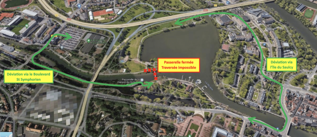 Cela ne sera pas sans conséquence sur le cheminement piéton et vélos localement. « Afin de mener à bien ces opérations, l’accès à la passerelle Hildegarde sera fermé à toute forme de circulation, y compris piétonne, entre le 21 et le 24 mai prochain (inclus). Un plan de déviation sera mis en place », indique la Ville de Metz. Ces déviations se feront via le boulevard Saint-Symphorien ou l’île du Saulcy.