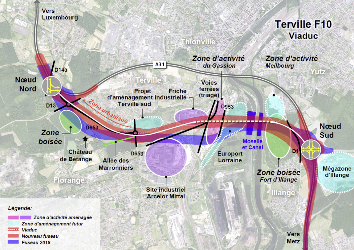 • Variante F10 : « Améliore la desserte de l’Est de Thionville ; n’améliore pas la desserte des vallées de l’Orne et de la Fensch ; limite, de par son tracé, les impacts sur le milieu urbain. »