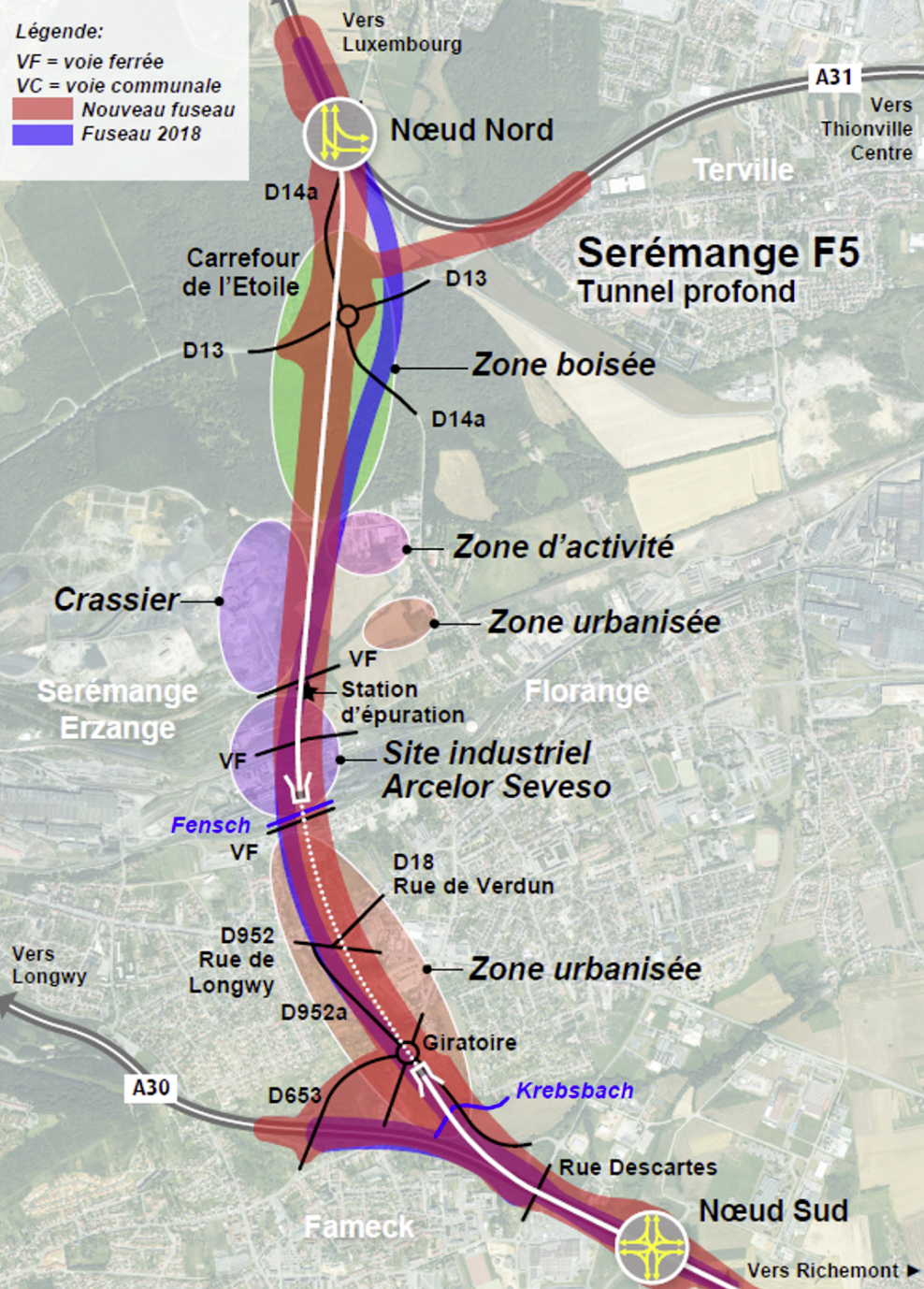 • Variante F5 – Tunnel profond : « Améliore la desserte des vallées de la Fensch et de l’Orne ; cherche à réduire les impacts sur le milieu urbain avec la création d’un tunnel long de 1,2 km ; est soumise à la dépollution des sols liée au passage en déblais sur le site de la cokerie. »