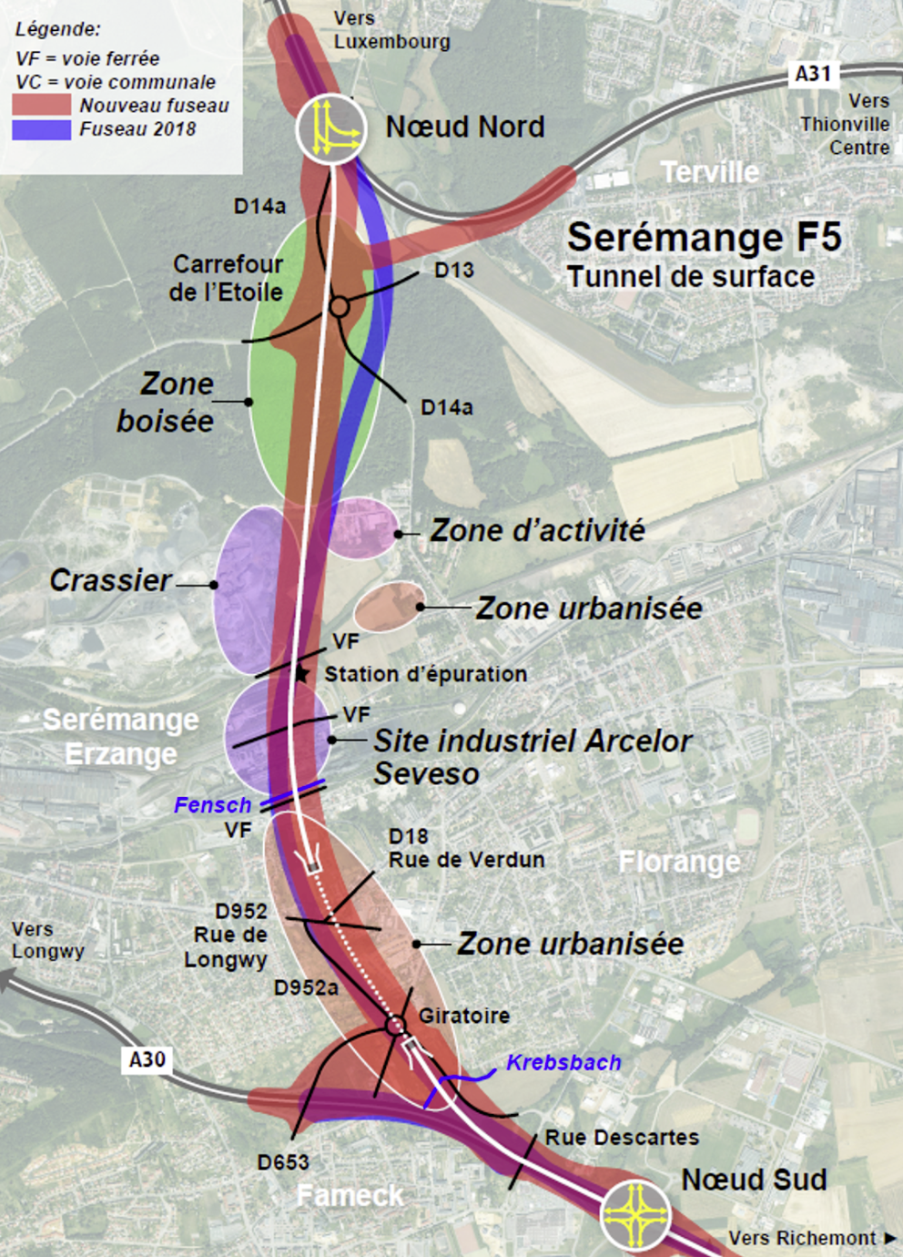 • Variante F5 – Tunnel de surface : « Améliore la desserte des vallées de la Fensch et de l’Orne ; cherche à réduire l’impact sur le milieu urbain avec la création d’un tunnel peu profond long de 850 m ; est soumise à la dépollution des sols liée au passage en remblais sur le site de la cokerie. »