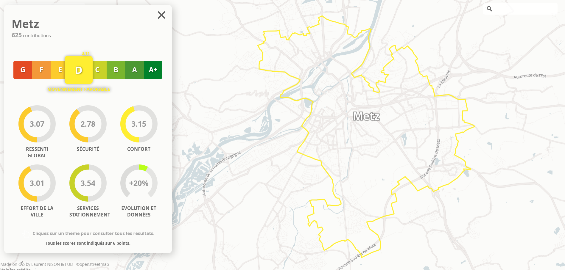 Les réponses des habitants aux différentes questions posées vont permettre d’attribuer une note allant du A+ au G et une couleur en fonction des efforts effectués par la municipalité. Les résultats seront présentés le 10 février 2022 à l’occasion du Congrès de la Fédération des usagers de la bicyclette.