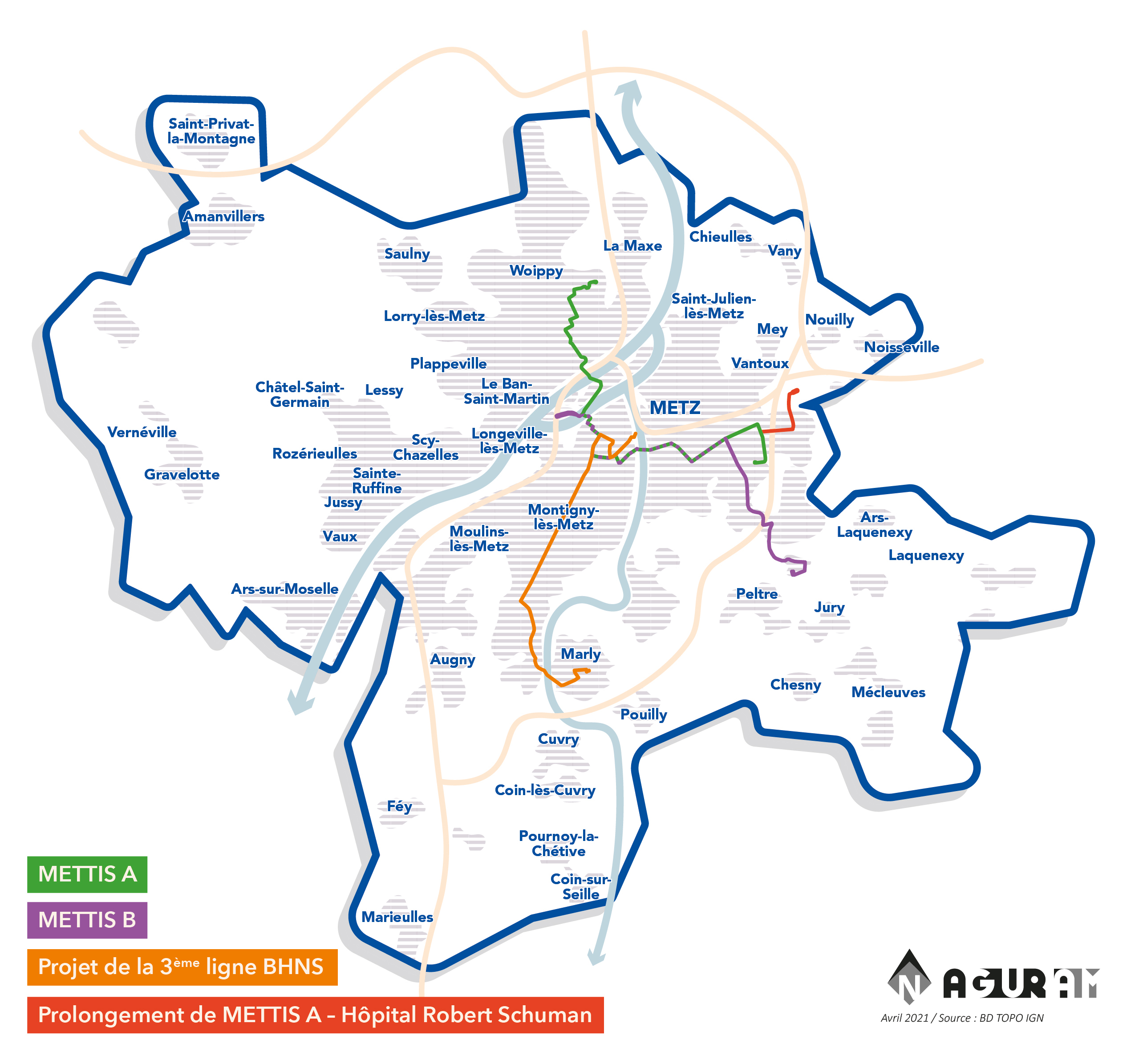 Alors que plusieurs autres possibilités avaient été évoquées, le tracé final a été choisi suite à la réalisation de plusieurs études. « Le corridor Franiatte est celui qui dessert le plus d’habitants, et concerne 15 000 emplois. Il s’agissait donc du ratio le plus important au kilomètre », explique Béatrice Agamennone. Selon les calculs de la métropole, 38 000 habitants se trouveront dans un rayon de 500 m du tracé de cette nouvelle ligne. Si le terme « busway » a un temps été évoqué pour nommer cette nouvelle ligne, il n’est plus une possibilité en raison de son caractère de marque déposée. Le nom de cette « troisième ligne de Mettis » n’a pas encore été tranché.