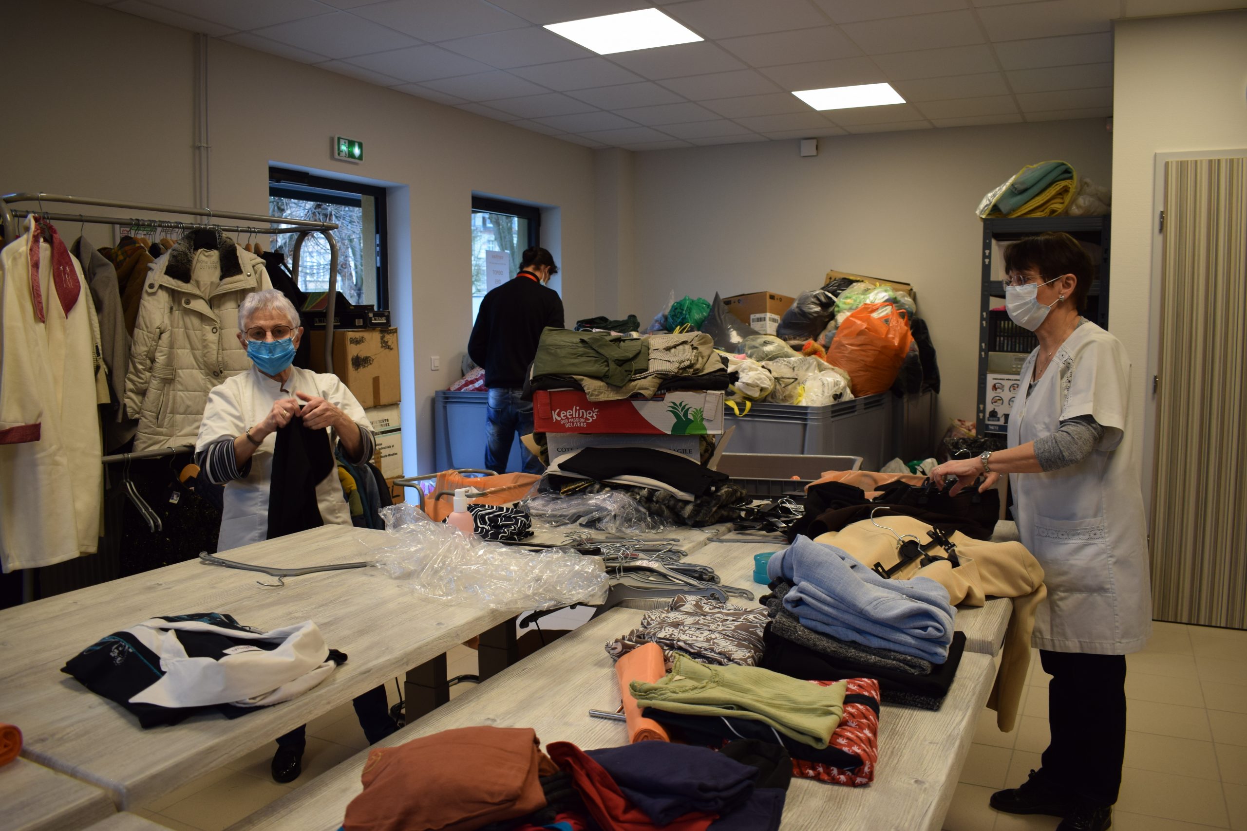 Dans les coulisses du vestiaire aussi, on se satisfait de ce déménagement. « Ici, c’est le nerf de la guerre », plaisante à demi-mot Jean-Louis Legrand en présentant l’espace dédié aux dons et au tri. Pendant que les bénévoles bricoleurs travaillent sur les dernières finitions, ceux de l’espace de tri s’activent à scruter chaque vêtement avant de les proposer pour le vestiaire. Le contrôle est une étape cruciale. « Le premier critère de tri reste la propreté, ensuite on regarde la qualité du vêtement afin de proposer de belles choses à nos bénéficiaires. » Ce travail d’observation s’opère sur des tables mécanisées installées pour faciliter le quotidien des bénévoles. Caritas Moselle en compte actuellement 75 et essaie de retrouver les 90 bénévoles qu’elle avait avant la crise sanitaire. Les locaux acquis, elle a besoin de mains pour répondre à une forte demande et propose des missions adaptées et variées à ses bénévoles (accueil, bricolage, tri des vêtements, administratif, accompagnement des bénéficiaires).