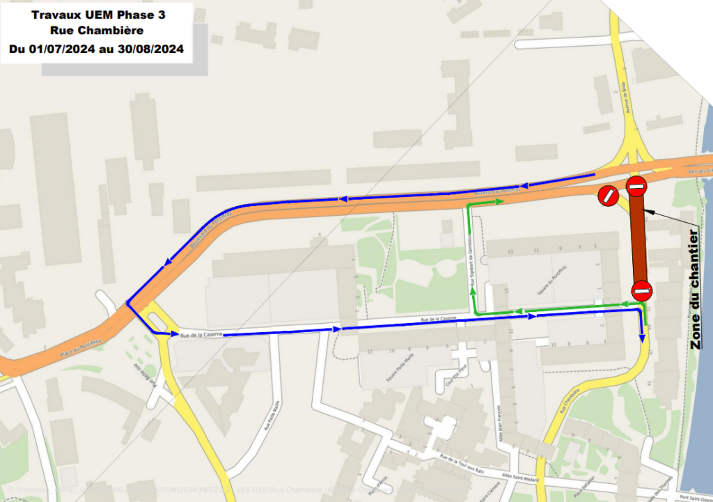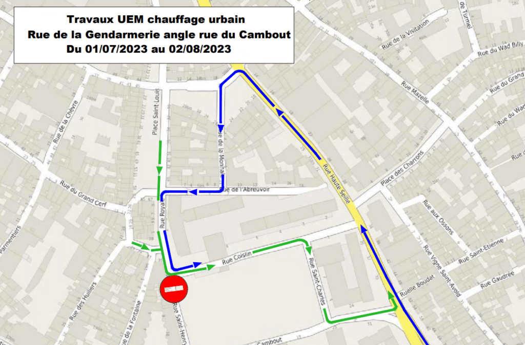 Des perturbations sont aussi à prévoir rue Charlemagne durant 13 semaines. Jusqu’au 27 septembre, la rue Charlemagne sera interdite à la circulation durant toute la durée du chantier et un plan de déviation sera mis en place. Du 1er juillet au 30 août rue Chambière et Pont des Grilles, dans le cadre de travaux de rénovation du réseau de chauffage urbain, le tronçon de la rue Chambière compris entre la rue de la Caserne et le boulevard Pontiffroy, sera interdit à la circulation durant toute la durée du chantier et une déviation sera mise en place. Les arrêts de bus seront également impactés,