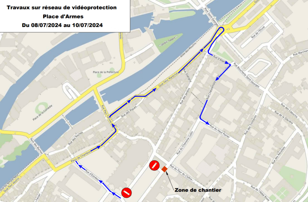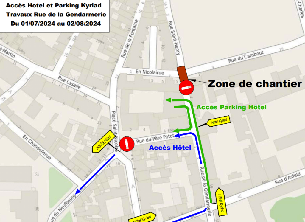 En conséquence, la rue de la Gendarmerie, au niveau du croisement de la rue du Cambout, sera interdite à la circulation durant toute la durée du chantier. Une déviation sera mise en place. Les accès à l’hôtel Kyriad seront maintenus avec une signalisation spécifique.