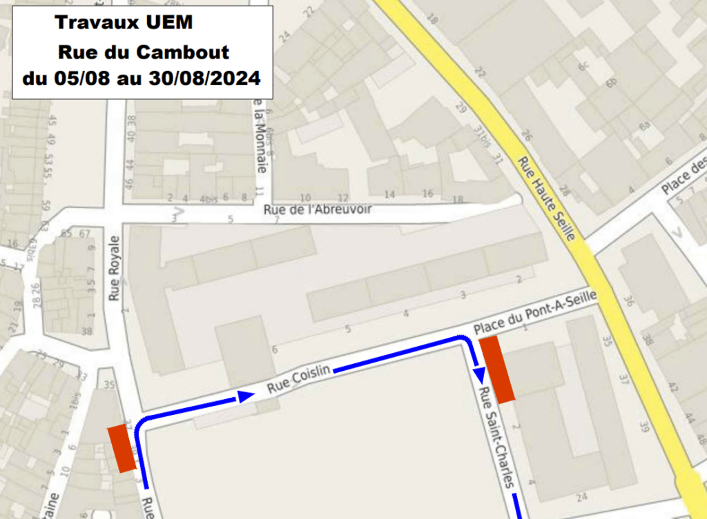 Le tronçon de la rue du Cambout compris entre la rue Saint Henry et la rue Saint Charles, sera interdit à la circulation durant toute la durée du chantier. Une déviation sera mise en place