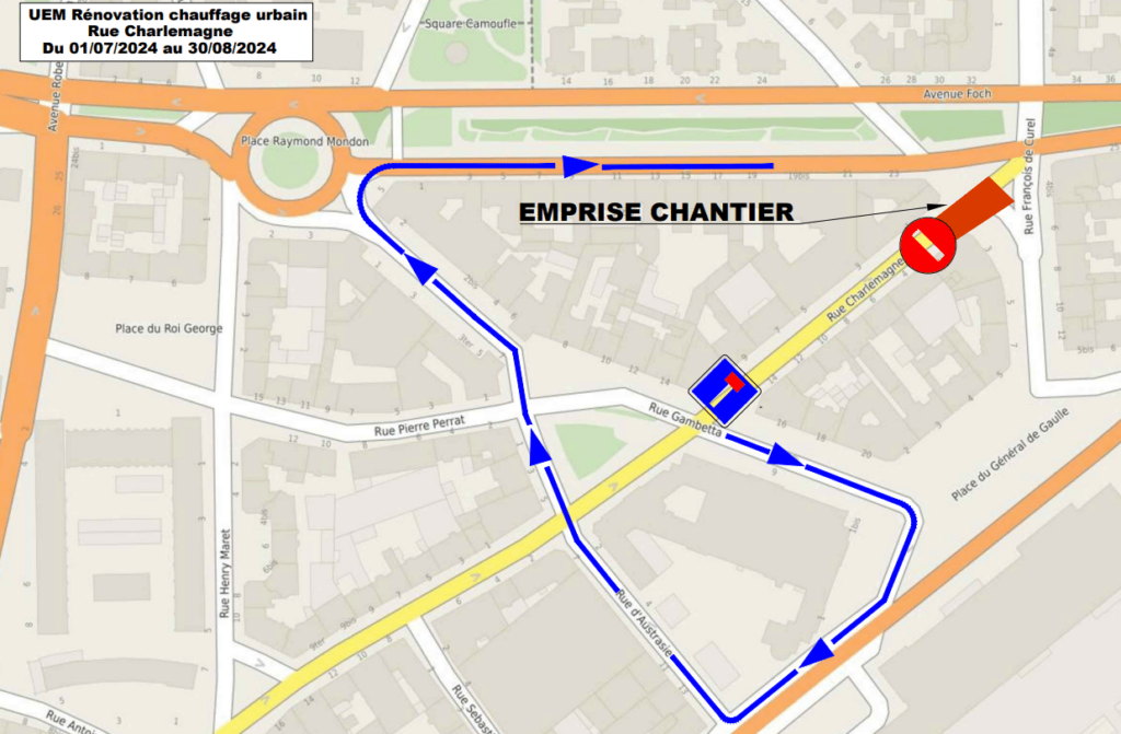 Des perturbations sont aussi à prévoir rue Charlemagne durant 13 semaines. Jusqu’au 27 septembre, la rue Charlemagne sera interdite à la circulation durant toute la durée du chantier et un plan de déviation sera mis en place. Du 1er juillet au 30 août rue Chambière et Pont des Grilles, dans le cadre de travaux de rénovation du réseau de chauffage urbain, le tronçon de la rue Chambière compris entre la rue de la Caserne et le boulevard Pontiffroy, sera interdit à la circulation durant toute la durée du chantier et une déviation sera mise en place. Les arrêts de bus seront également impactés,