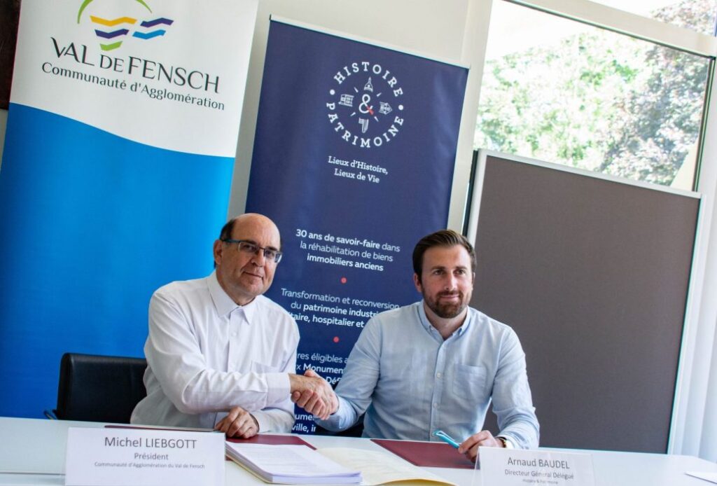 Michel Liebgott (à g.), président de la communauté d’agglo, et Arnaud Baudel, DG délégué d’Histoire & Patrimoine, ont signé mardi 19 juillet Photo CA Val de FenschLa communauté d’agglomération du Val de Fensch a officiellement vendu, mardi 19 juillet, ces bâtiments symboliques de l’histoire sidérurgique du territoire, pour un montant de 675 000 euros.