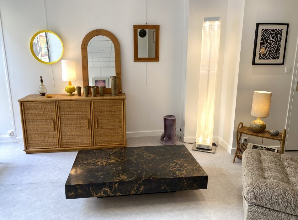 La commerçante a pensé son magasin comme un intérieur de maison. On y retrouve une cinquantaine de pièces allant des petits objets d’art décoratif, au mobilier et aux œuvres de collection. Disposées parmi elles, ses dernières trouvailles : une table basse façonnée par le célèbre céramiste des années 1950/1960 Roger Capron et des lampes en pierre réalisées par le sculpteur français Albert Tomos sur la même période. Après des années à graviter autour du marché de l’art pour des galeristes et antiquaires parisiens, Justine Michaux a choisi de s’écouter et de renouer avec ses racines en revenant ouvrir son commerce à Thionville.