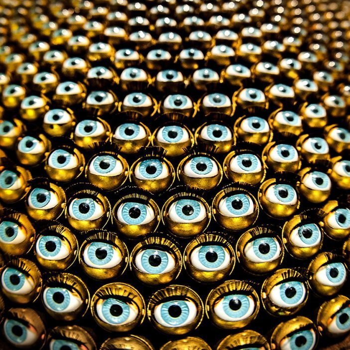 C’est son tableau signature, sa marque de fabrique… C’est aussi sa toute première création. « J’ai obtenu sur eBay une boîte d’yeux dormeurs anciens venant d’Angleterre. Ils étaient rangés alignés, protégés dans une mousse perforée. J’ai pris la boîte, je l’ai mise à la verticale et ça m’a semblé évident que ça devenait un tableau. » Ce fut le premier, suivi de beaucoup d’autres. Depuis, elle collectionne les yeux (de verre, mécanismes anciens de poupée, etc.) « pour leur symbolique forte et leur esthétique ». « Je suis devenue un as des enchères eBay ! » Jusqu’au jour où le fameux vendeur anglais la contacte en lui expliquant qu’il possède un stock complet d’une ancienne clinique de poupées fermée depuis des années, lui demandant si elle connaissait quelqu’un que cela pouvait intéresser. Évidemment, elle le récupère. « Quand le stock sera épuisé, il n’y aura plus de tableaux. » Avec cette œuvre, Emmanuelle de Rosa inverse la proposition artistique : pour une fois, c’est le tableau qui vous regarde…