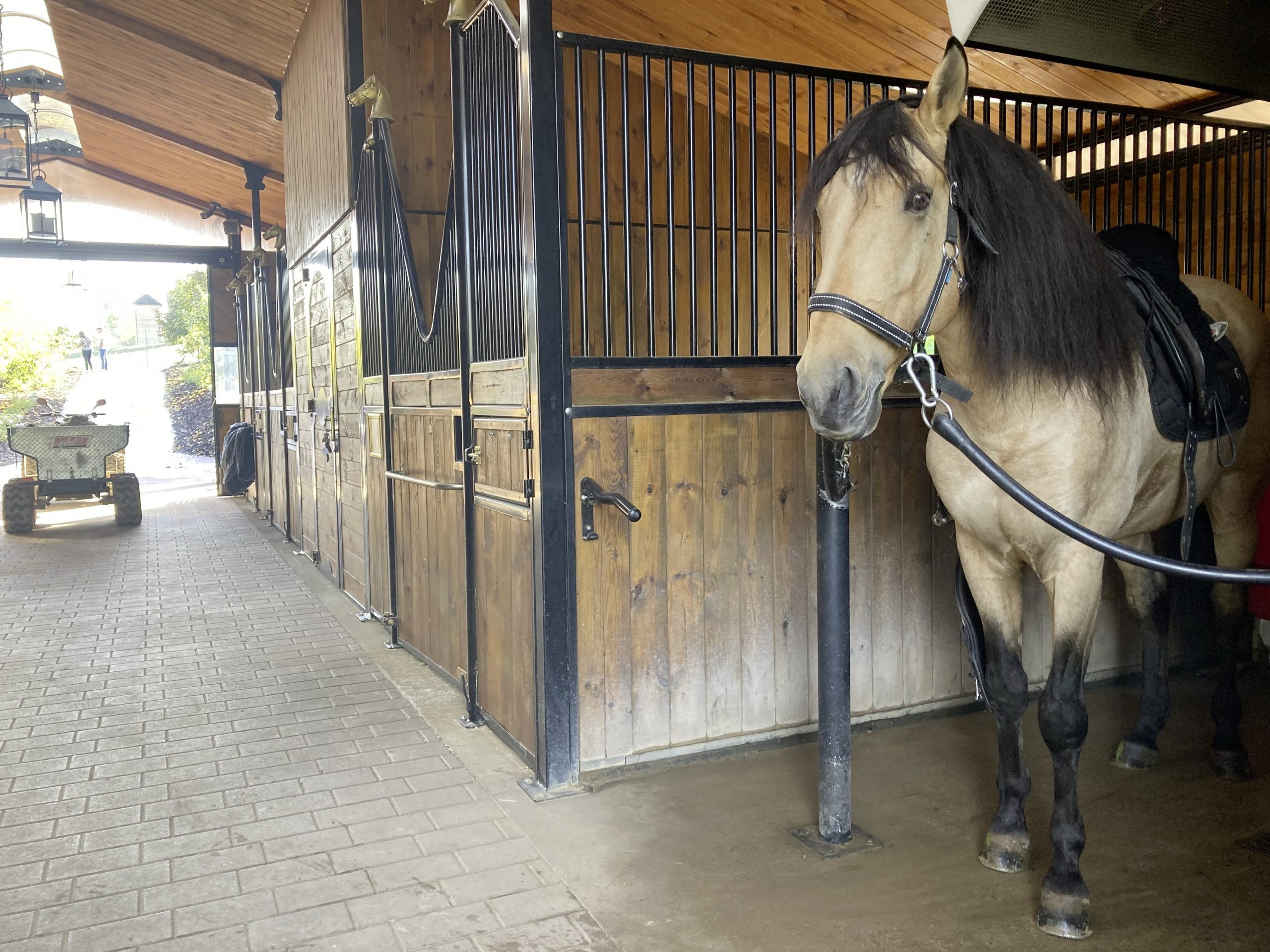 Encore quelque pas, et se présente le haras. Huit chevaux, tous espagnols, cajolés là. À l’heure du petit-déjeuner, ils se dérouillent les pattes sur leur piste dédiée. Pour les clients, c’est tout un spectacle. Des excursions sont également proposées. Ainsi que des démonstrations. Au moment de notre visite, deux montures patientaient dans leur box, à côté du solarium installé rien que pour leur pelage. Leurs congénères se trouvent au pré. Il y a là de l’espace, un terrain de jeu sans limites ou presque. Encore une trouvaille d’Alexandre Keff, inspirée par son fils, Louis-Alexandre, qui l’a incité un jour à monter.