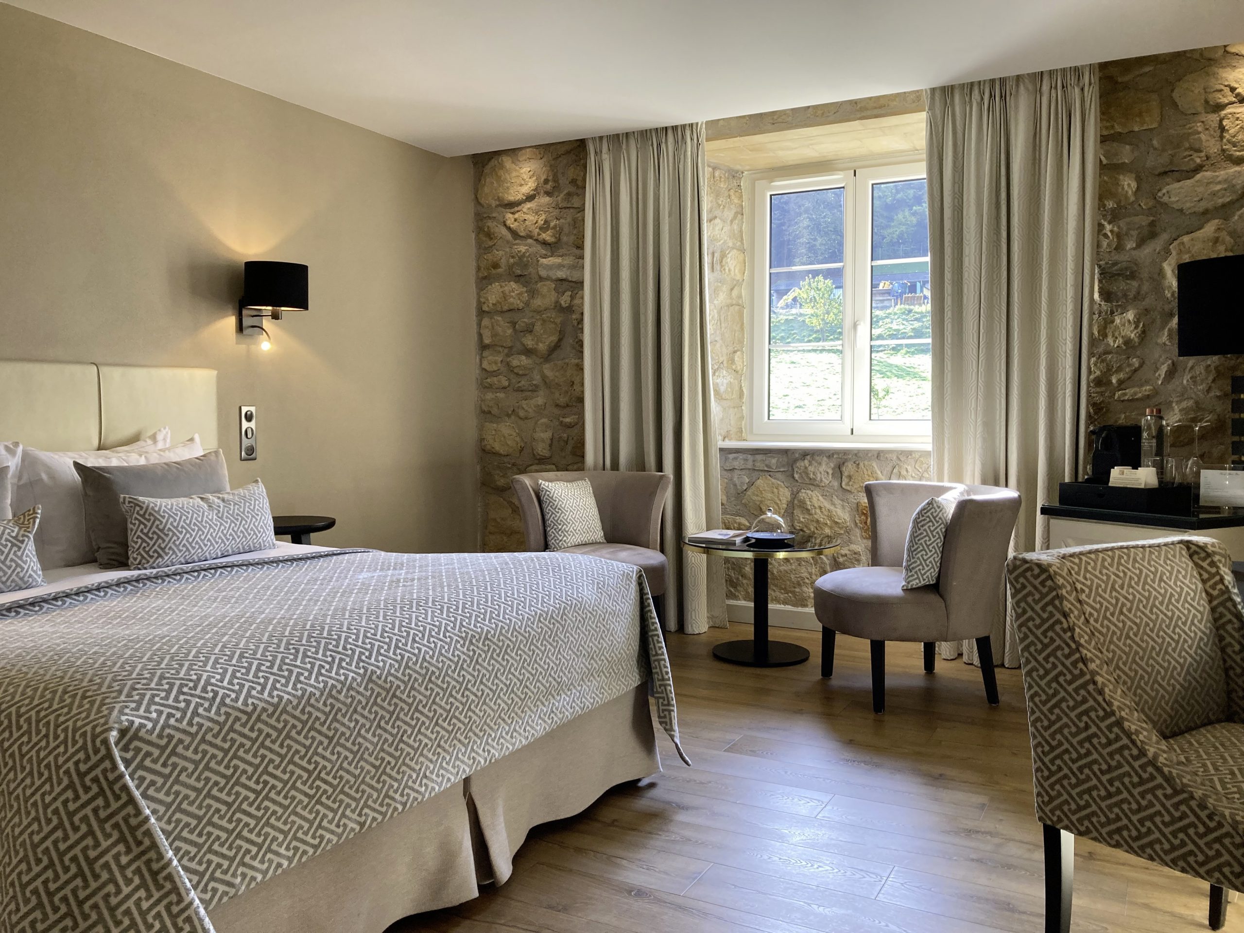 « Je ne me sens pas forcément à l’aise, le luxe ce n’est pas mon monde habituellement. » Souvent, à l’accueil comme en salle, ce sont des mots qui sont prononcés. Des mots qui n’ont pas lieu d’exister. Le Domaine de la Klauss fait fi du bling-bling et de l’entre-soi. De toute façon, son décor parle pour lui. Vieilles pierres d’époque et mise en scène minimaliste, où l’on table sur le chaud des harmonies, des couleurs profondes, le détail d’un fauteuil en velours, la majesté discrète d’un lustre qui doit peser son poids mais que l’on ne remarque pas… À quoi bon en rajouter ? À Montenach, on dit sans surligner.