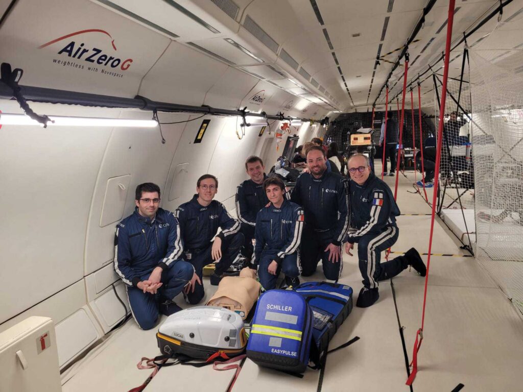 En 2023, le Centre National d’Études Spatiales (CNES) lance un appel à projet. Celui du Dr Michaël Lescroart et Nathan Reynette est retenu. Ce qui les a amenés à tester leur protocole dans des vols paraboliques dans un Airbus A310 prévu pour ce genre d’intervention. « C’est un avion complètement modifié, vidé de l’intérieur et transformé en laboratoire qui va faire des vols à répétition en chute libre et où on va pouvoir se retrouver en impesanteur pendant 22 secondes ».