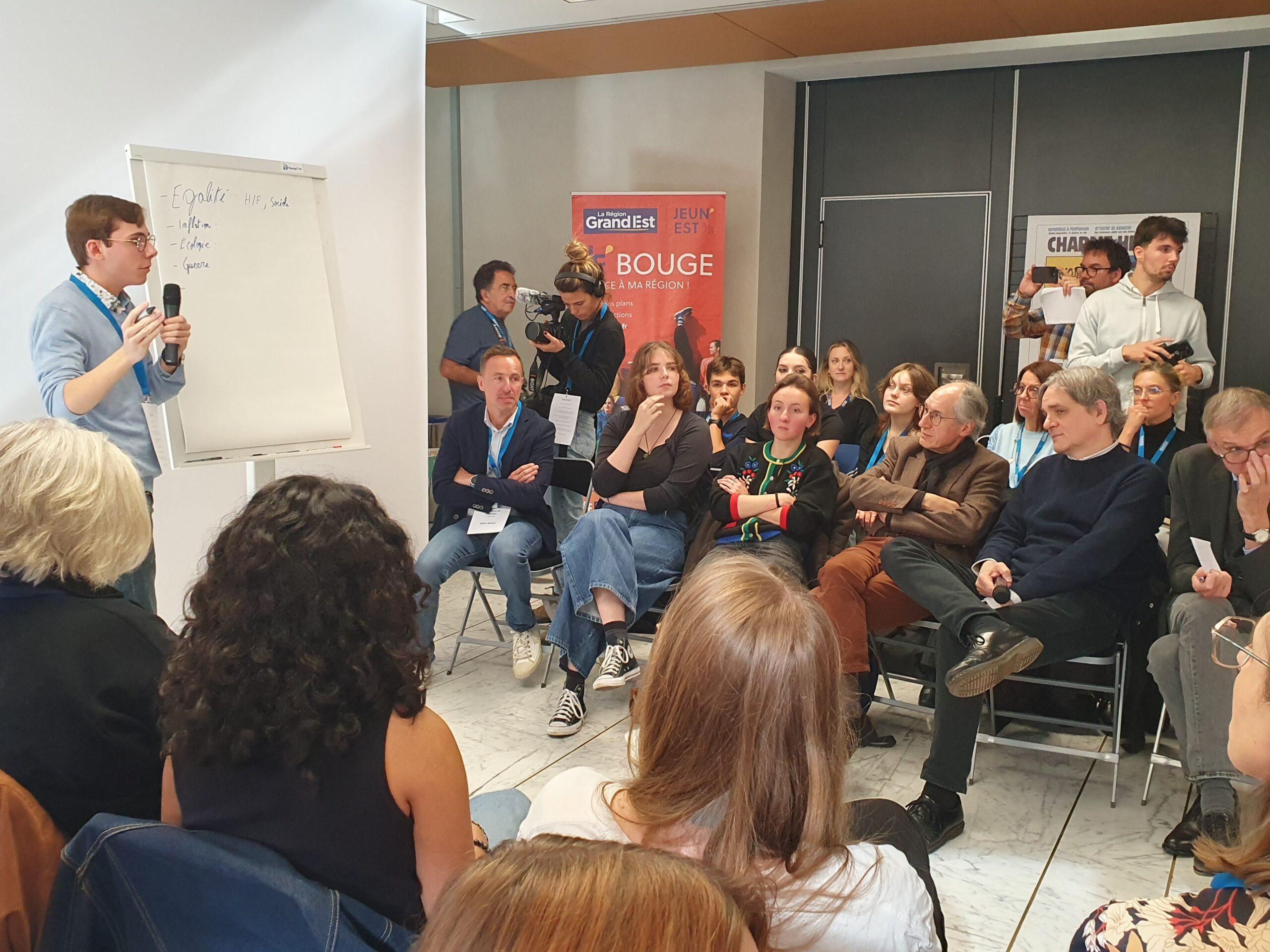 Voitures blindées, service de haute sécurité… Il fallait montrer patte blanche mardi 1er octobre 2024 pour entrer dans l’Hôtel de Région. Déjà le signe d’un événement à part. Pourquoi tant de sécurité ? Car les journalistes de Charlie Hebdo – toujours sous haute protection – font le déplacement jusqu’à Metz. Et pas n’importe lesquels, il s’agit de pointure : les célèbres Riss, directeur de la publication et Gérard Biard, rédacteur en chef. Ils sont entourés de la dessinatrice Lorraine Redaud et de Julie Lescarmontier, journaliste récemment arrivée au sein de la rédaction.