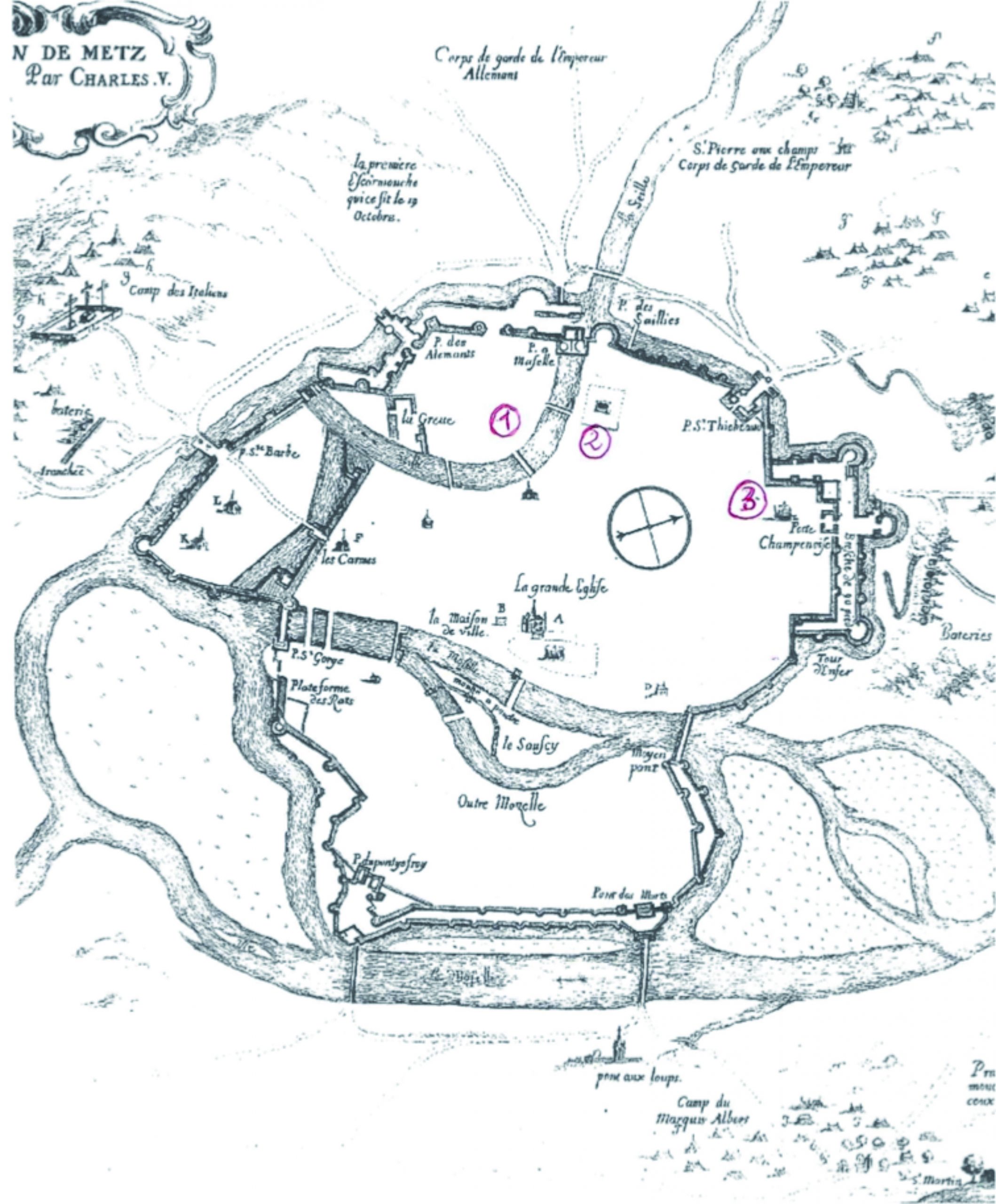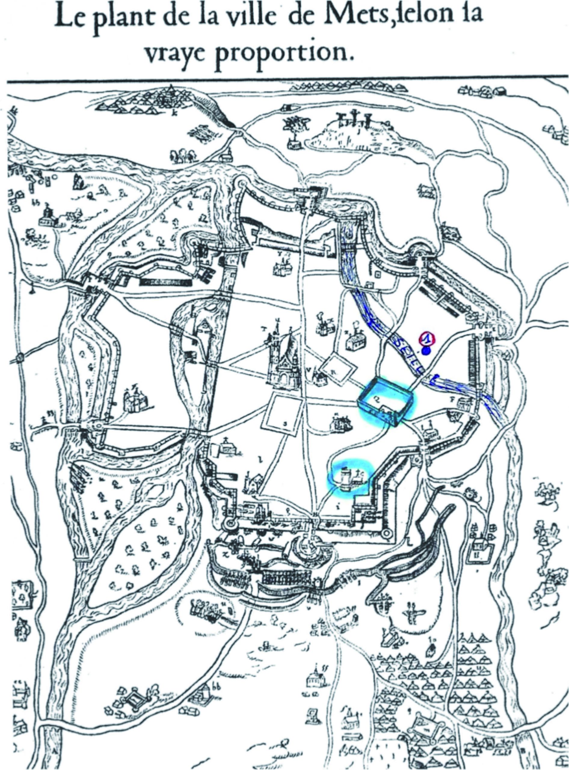 Il est à noter que sur ce plan, pas plus que sur celui de Sébastien Le Clerc un siècle plus tard, aucun bâtiment en dehors des églises Saint-Eucaire et Saint-Maximin n’est dessiné entre la rive droite du bras intérieur de la Seille et les murailles (sans doute la précision de la topographie intra-muros n’était pas la préoccupation essentielle de leurs auteurs). L’on sait cependant que l’actuel hôtel de Burtaigne existait depuis le début du XVIe siècle (en 1531 y avait été célébré le fastueux mariage de Claude de Gournay avec Catherine de Créhange). Il semble en tout cas peu probable que Guise ait pris le risque d’établir son « logis » sur la rive est de la Seille (actuelle rue Haute-Seille), à l’écart du centre névralgique de Metz alors situé sur la rive gauche, et à proximité des murailles de la cité.