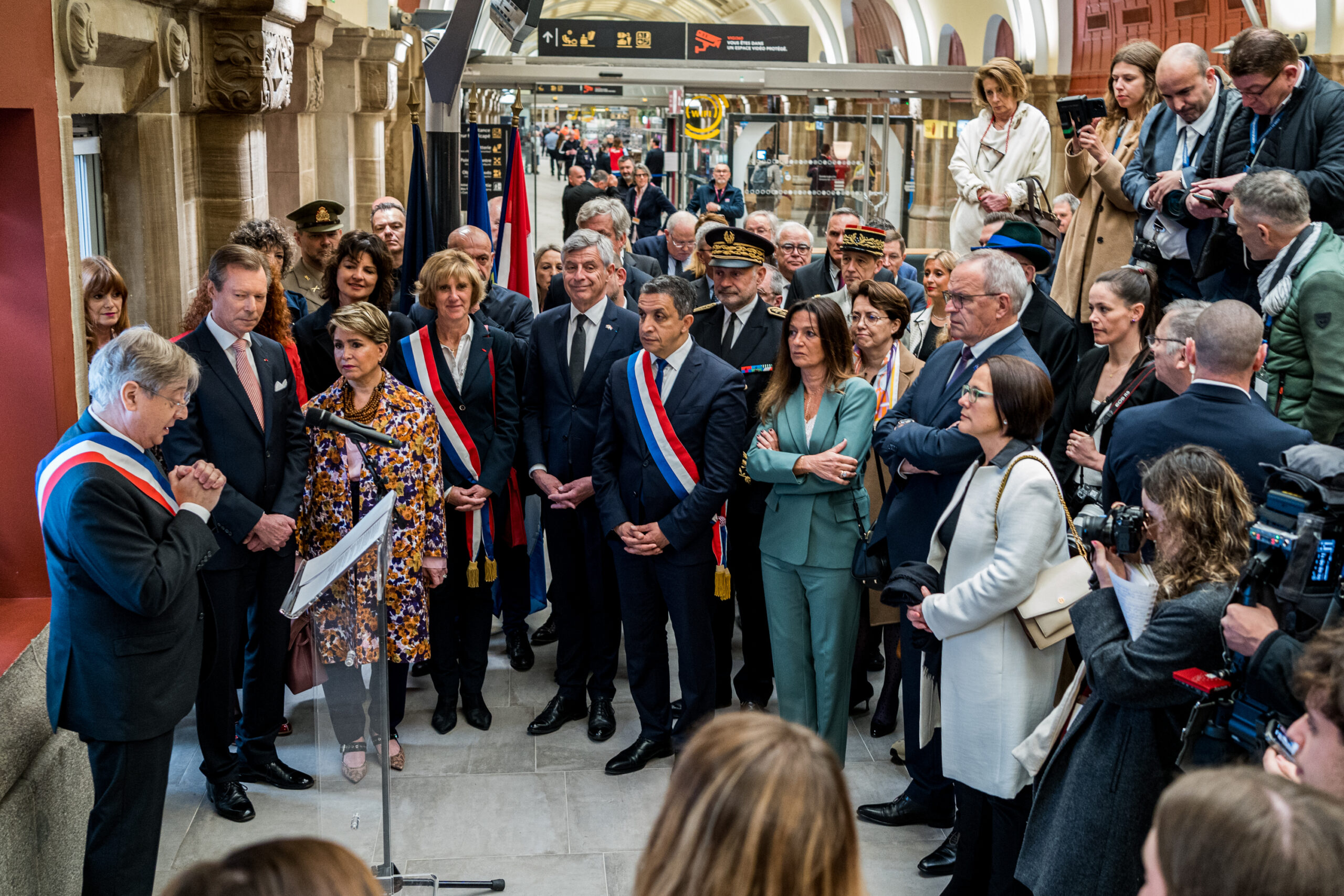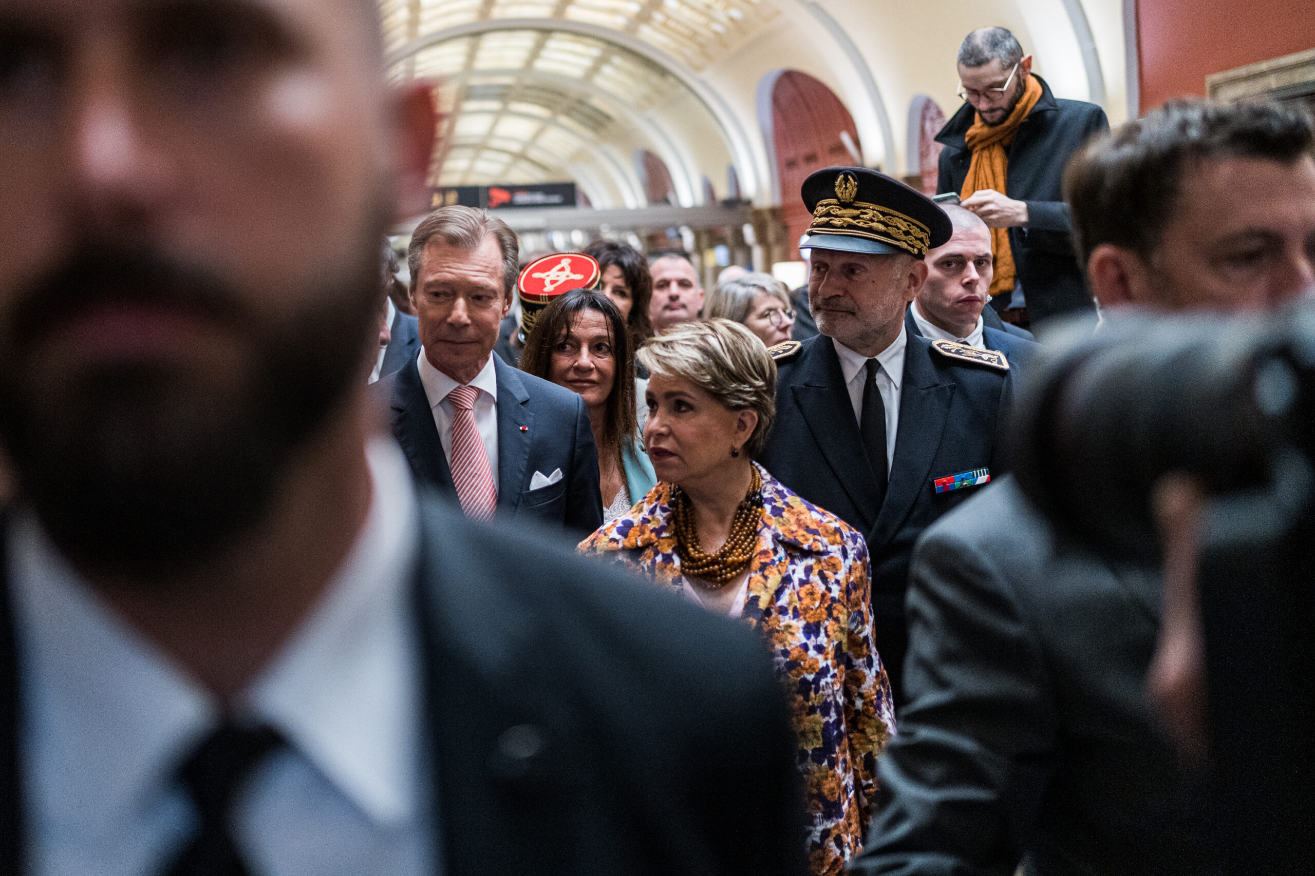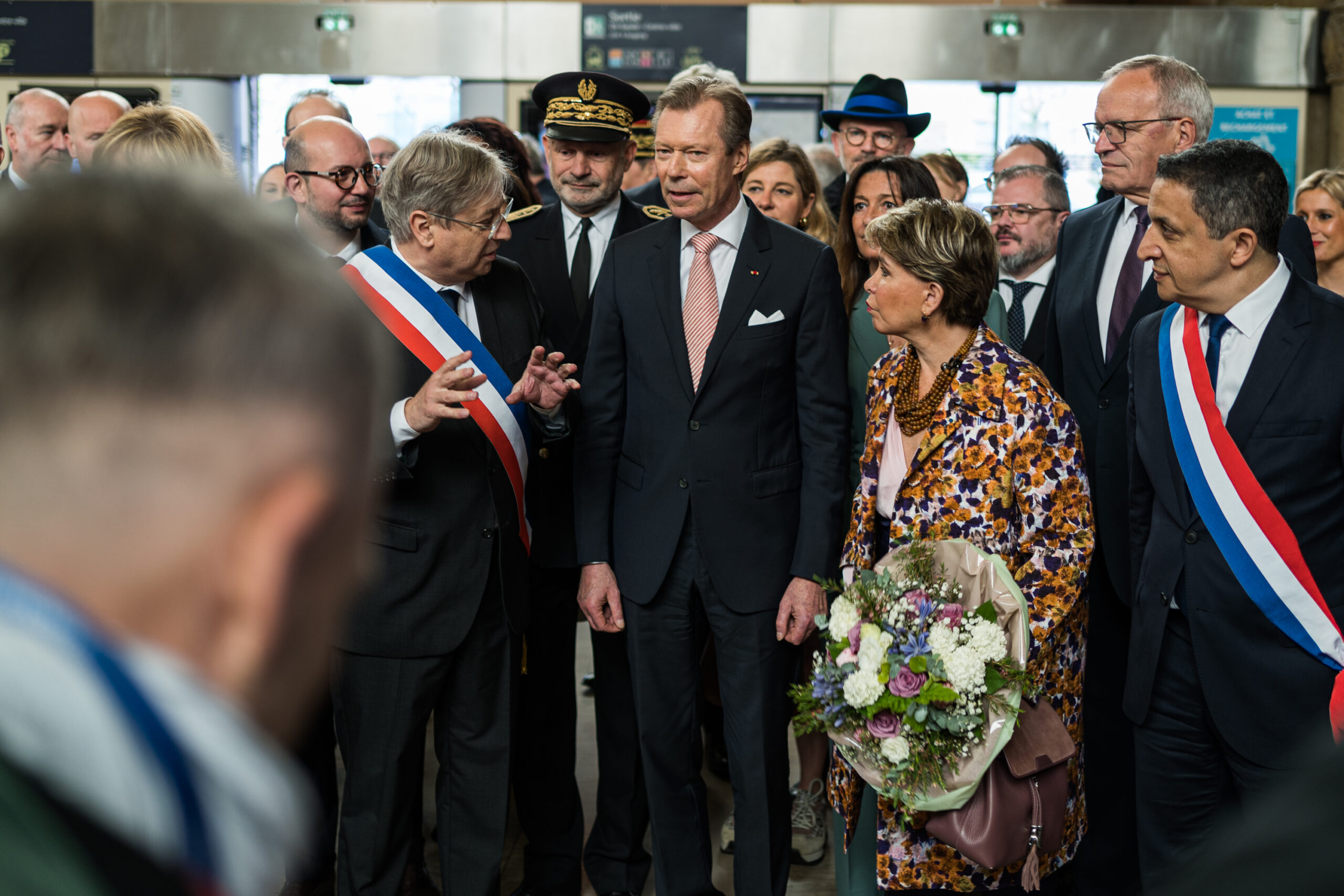 10 h sur la place du général de Gaulle, ballet incessant de policiers et de représentants de l’État pour l’arrivée du couple grand-ducal. Plusieurs usagers s’interrogent sur cette effervescence devant la gare, d’autres sont bien déterminés à voir le grand-duc et la grande-duchesse. Un convoi arrive et s’arrête sur le parvis, le grand-duc et son épouse sortent d’une grosse berline allemande, photographes et journalistes se bousculent et les élus s’apprêtent à saluer leurs invités. « Bienvenue dans la plus belle gare de France », s’exclame le maire de Metz. Après les salutations, le protocole reprend. François Grosdidier et le couple grand-ducal s’engouffrent dans le hall de la gare. Ils avancent vers la Maison du Luxembourg, le maire de Metz continue sa présentation du bâtiment.