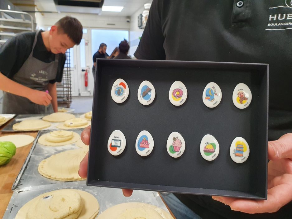 Frédéric Hubert vit alors une période charnière. Il s’apprête à devenir papa. Dès lors, c’est naturellement qu’il choisit d’organiser un concours de dessins en direction des enfants d’Élange. Ces derniers doivent imaginer les fèves de 2023 sur le thème de sa boulangerie. Une quarantaine de dessins seront récoltés, esquissés par de jeunes artistes âgés de 3 à 11 ans. Dix seulement seront retenus. « Nous nous sommes concertés avec mon personnel mais c’était très difficile car, des dessins d’enfants, on aurait envie de tous les sélectionner. Nous avons essayé d’être le plus juste possible. » Ils finissent par faire un choix par catégorie d’âge, avec des pâtisseries représentées mais aussi des choses plus enfantines. Les dessins retenus, reste maintenant à les envoyer à Panessiel pour la confection. En novembre dernier, les 4 000 fèves sont réceptionnées. Une certification made in France qui se paye un peu plus cher. « Nous sommes à 10 % de plus. Nous répercutons le surcoût sur les galettes mais, malgré tout, nos prix restent raisonnables », développe Frédéric Hubert. Comptez 25 euros pour une galette pour huit personnes. « Je préfère faire travailler une entreprise française qui a des règles. Ainsi, je peux savoir qui a fabriqué ces fèves quand, sur les autres réalisations, je ne peux avoir de certitudes sur l’âge des ouvriers. » Convaincu, l’artisan réitérera ce partenariat l’année prochaine mais sur une autre thématique : des fèves apportant un soutien à une association ou illustrant l’engagement des pompiers du territoire… Plusieurs idées jaillissent mais la réflexion n’en est qu’à ses débuts. « Nous en discuterons fin janvier avec l’équipe », précise-t-il. En attendant, Frédéric Hubert aime s’imaginer les instants de bonheur que vont procurer les fèves « maison » 2023 : « Vous êtes en famille, et vous retrouvez la fève réalisée par votre fils ou votre fille. C’est forcément une fierté ! »