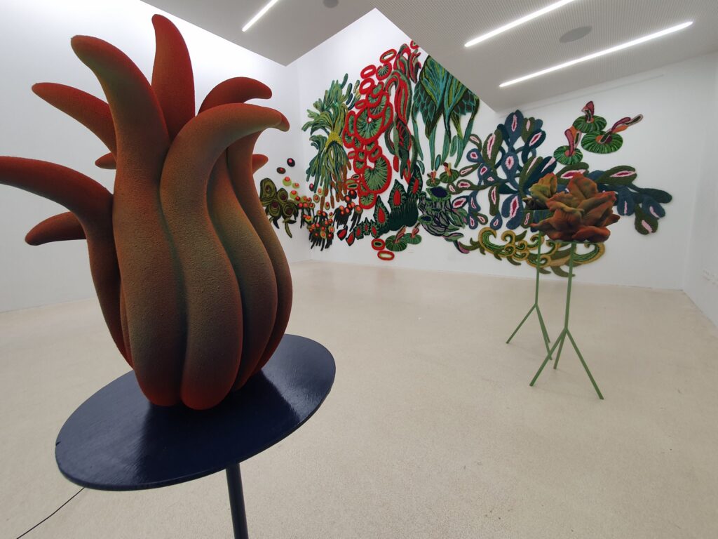 Au moins tout autant que celui réalisé sur les céramiques qui leur font face. Cette fois, ce sont des touffes d’herbes qui s’invitent dans l’espace grâce à la technique du colombin. Elles ont été imaginées par Safia Hijos. Des pousses sauvages qui viennent aussi habiller de leurs couleurs, la salle blanche. Celles-ci sont de la main d’une seconde céramiste, Claire Lindner. L’artiste joue sur les oppositions, ses œuvres intégrant « une tension entre l’esthétique et les textures, entre le doux et le dur, le léger et le lourd ».