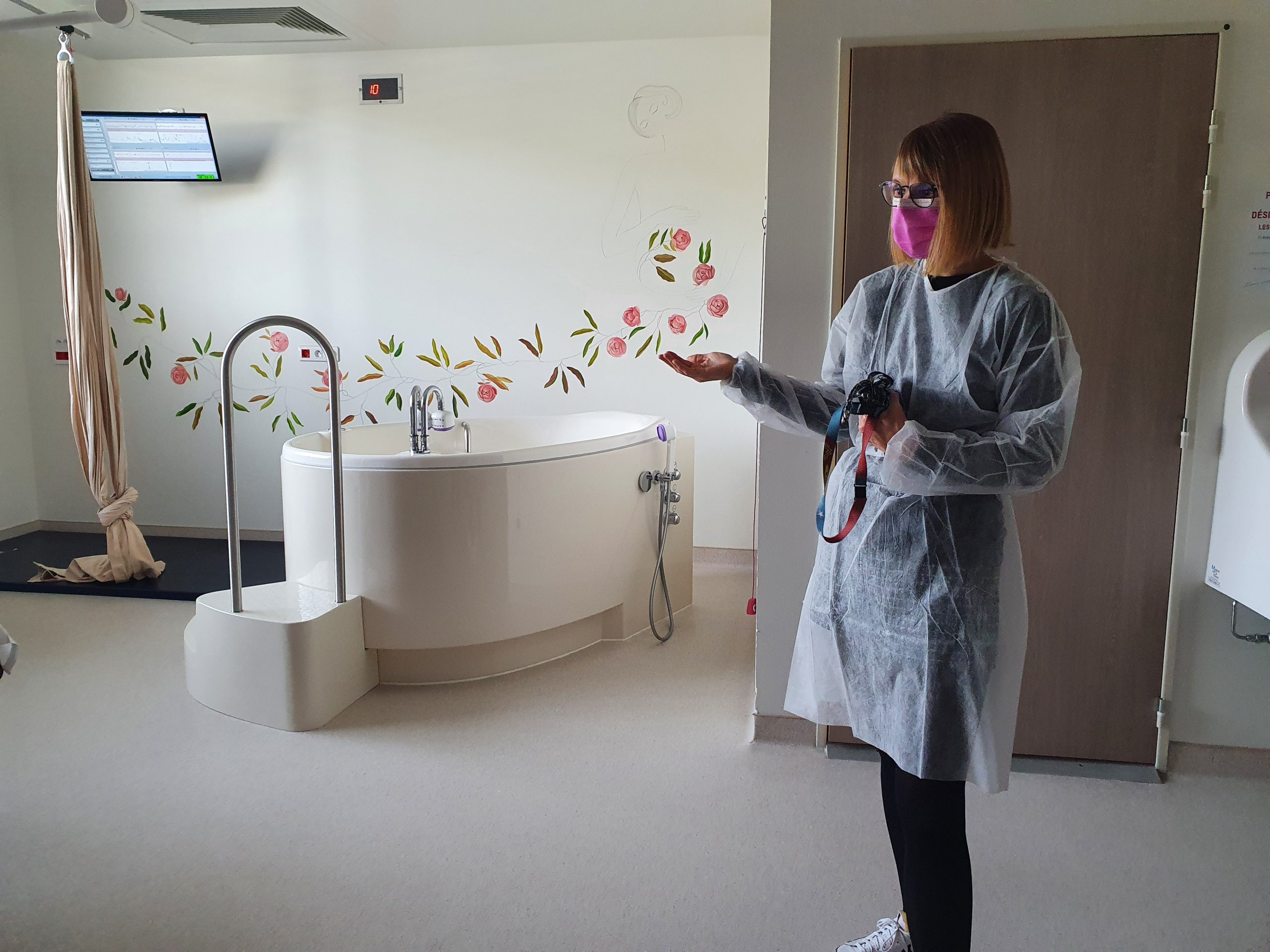 Ceci dit, on nous emmène découvrir la salle nature, un service qui n’existait pas avant la construction de l’hôpital Femme-Mère-Enfant. Elle se distingue des autres salles car au premier abord, elle ne paraît pas médicalisée mais cache dans ses placards tout le nécessaire pour intervenir si l’accouchement vient à se compliquer. L’idée est de s’adapter au projet de naissance de certains parents tout en limitant les accouchements à domiciles, jugés plus risqués car il n’y a pas de plateau technique à proximité.