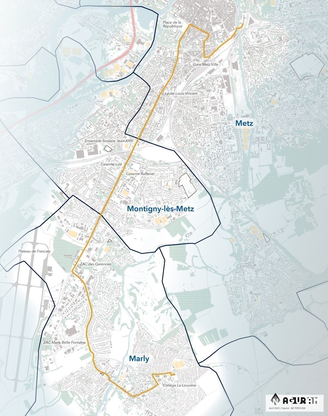 Elle part du NEC à Marly, traverse le centre-ville de la commune, rejoint la rue Franiatte à Montigny puis celle du XXe Corps américain, le quartier Sainte-Thérèse à Metz, la place de la République, la rue du Coëtlosquet, la place Saint-Martin ; deux options sont à l’étude pour la suite du trajet, un passage rue du Neufbourg puis rue François de Curel dans les deux sens ou rue du Neufbourg dans un sens, rue des Augustins dans l’autre. La Métropole privilégie la première solution qui identifie plus clairement les arrêts. Mettis poursuit ensuite sa route vers la gare, rue Vauban, avenue Jean XXIII pour s’arrêter place Mazelle. « On voulait desservir le quartier de Ranconval mais il sera toujours en travaux lors de la mise en service de la ligne en 2025, on va donc, pour l’instant, s’arrêter place Mazelle, avec une possibilité d’évoluer par la suite comme d’imaginer un prolongement vers Devant-les-Ponts, la Patrotte et Bliiida », explique Béatrice Agamennone. Dans le même temps, la ligne A sera rallongée pour desservir l’Actipôle de Borny et l’hôpital Schuman où un parking-relais de 200 places sera installé.