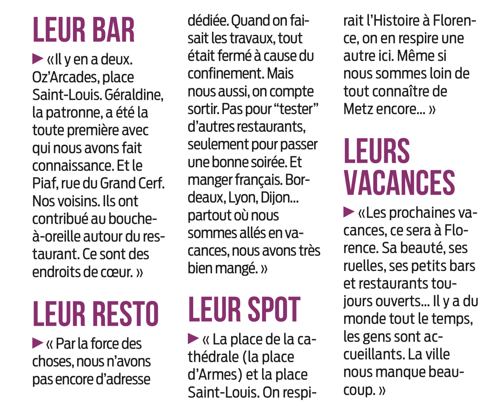 Une nouvelle vie, oui. Des larmes, aussi. Et puis l’enthousiasme, la surprise. « En Italie, le bouche-à-oreille ne se fait pas aussi vite… » Le plus dur est devant eux, sans doute. Confirmer. Continuer d’enchanter. Ils le savent. Avancent jour après jour. Demain, après-demain, ils l’imaginent en France. Une petite maison en Provence, « ou en Bretagne, en Normandie ». Ils verront bien. Actuellement, ils sont installés dans la périphérie de Thionville. Souhaitent trouver un nid à Metz. Pour vraiment vivre la ville. « Leur » ville, désormais. Elle leur évoque parfois Bologne quand leur regard se perd sur la place Saint-Louis. Bien sûr, il y aura d’autres petits matins frisquets. Caterina remontera son chandail sur ses épaules. Elle frissonnera encore. Parfois. Mais elle sera chez elle. Vraiment chez elle. C’est promis.