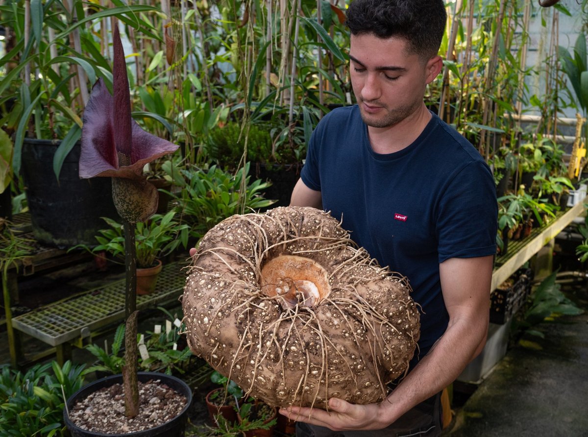 « Avec sa taille de près de deux mètres et son tubercule de 33 kg, nous avons ici une plante incroyable, explique Frédéric Pautz, le directeur du Jardin botanique. Il n’en reste que 4 000 dans les forêts menacées de l’île de Sumatra, qui souffrent de la déforestation pour l’huile de palme. Certaines sont cultivées dans des jardins privés, nous avons eu la chance d’avoir un semis il y a cinq ans, qui arrive aujourd’hui en inflorescence. C’est un événement qui arrive très rarement en France, et c’est la plus grande jamais observée dans notre pays. »