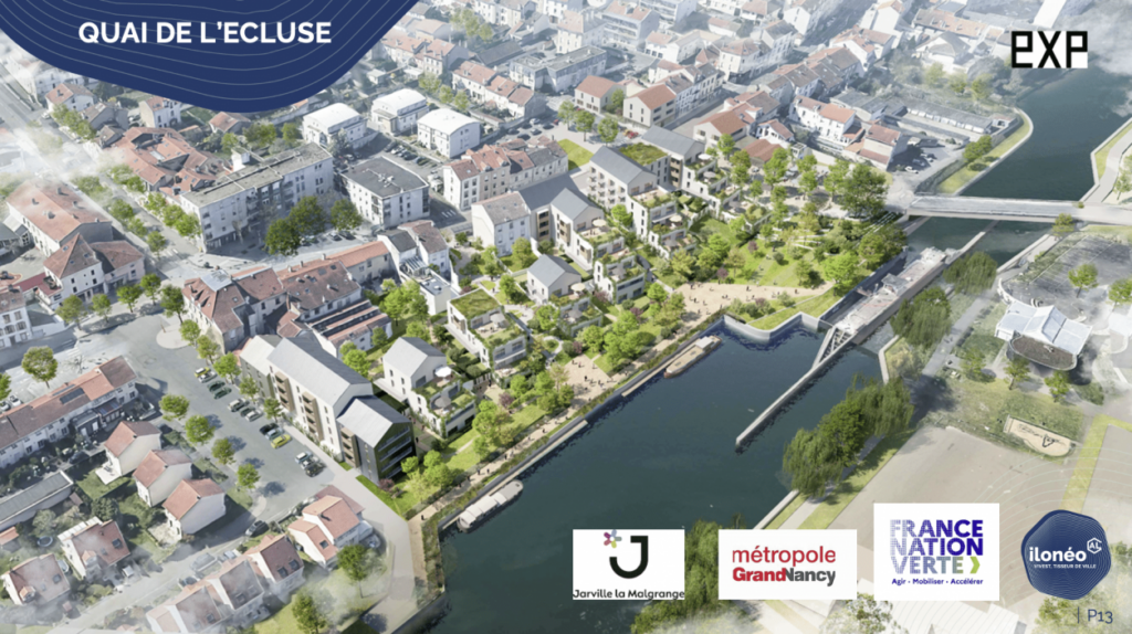 Deux projets de reconversion urbaine vont sortir de terre à Jarville-la-Malgrange. L’objectif est de végétaliser un maximum, créer un parc urbain ou encore de donner vie aux berges le long du canal. Ils concernent deux axes principaux : le quai de l’écluse et le 27 rue de la République, derrière la mairie. On fait le point. La commune de Jarville-La-Malgrange ne lésine pas sur les moyens. Deux grands projets devraient éclore d’ici les prochains mois. Le premier, concerne le 27 rue de la République, juste derrière la mairie. 51 logements ont été démolis, seulement 25 seront reconstruits. Le but ? Créer un accès direct au canal derrière la mairie et végétaliser le cœur de l’îlot. « Jarville est par essence verte. Elle est géographiquement reliée à l’eau que ce soit par le biais du canal, de la Meurthe ou par le ruisseau. Nous cherchons à procéder à la reconquête des berges du Canal », précise Vincent Matheron, maire de Jarville. Celui qui passe souvent par les concertations publiques, dit qu’il est « important de co-construire avec les citoyens ». L’urbanisation massive des années 1970 ne permet plus que d’entrevoir le canal aujourd’hui. Cela devrait changer d’ici le début des travaux estimé à juin 2024, pour une fin annoncée en octobre 2025. « Pour les nouveaux logements, plusieurs idées ont germé », note Dominique Anceaux, premier adjoint au maire. Un parc urbain, le square Lyautey, sera aussi aménagé. « Les logements démolis dataient de 1985. La réhabilitation immobilière ne permettait pas de donner les qualités d’usage d’aujourd’hui », explique Cécilia Jaeger, directrice générale adjointe de Vivest, acteur de l’habitat social sur les départements de Meurthe-et-Moselle et de Moselle. « L’accès au canal et le parc urbain Lyautey seront un lieu de promenade pour tous les Jarvillois et permettront de mieux intégrer le logement social dans la ville. L’espace stationnement souterrain a été conservé, il sera disponible aux locataires mais des places seront aussi louées pour les élus », ajoute-t-elle. Le parvis devant la mairie sera réaménagé et végétalisé pour correspondre aux réalités climatiques survenant en été. Le projet coûtera 5 800 000 euros, hors taxes. Ce chiffre comprend la démolition (390 000 euros), la reconstruction et l’aménagement du square Lyautey.