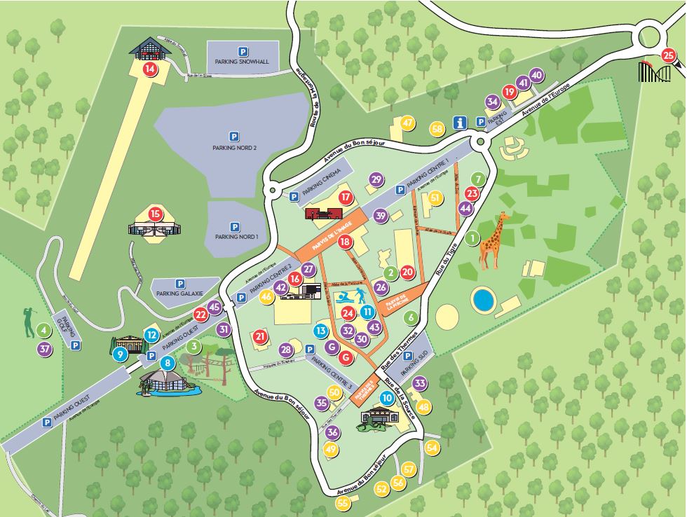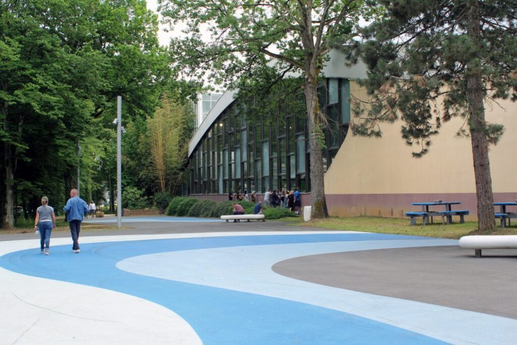 Pour les piétons, la sécurisation du lieu est ainsi passée par l’aménagement de trois grands parvis colorés, connectés entre eux par des chemins. Ce nouvel aménagement permet de distinguer clairement trois espaces de loisirs : en bleu, les activités autour des termes, en rouge, celles qui sont environnantes au cinéma et à l’E-max, et en vert, les activités situées entre le mini-golf et l’Aquarium d’Amnéville. « Il s’agit d’espaces entièrement sécurisés, visant à faciliter la déambulation, où les enfants peuvent être lâchés sans crainte », indique le chargé du projet.
