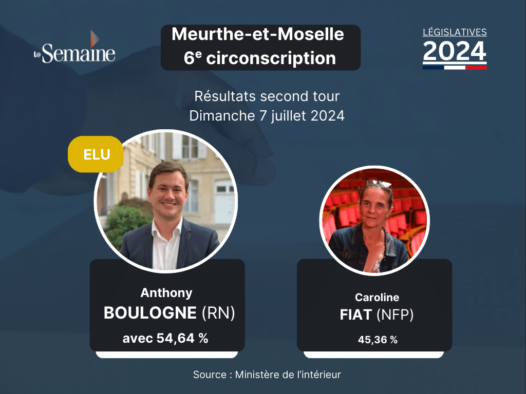 La 6e circonscription de Meurthe-et-Moselle passe dans le giron du Rassemblement national avec la victoire d’Anthony Boulogne.Dans la 6e circonscription de Meurthe-et-Moselle, la députée sortante Caroline Fiat s’incline. La candidate LFI perd son duel contre le candidat RN Anthony Boulogne au second tour des législatives, qui cumule 54,64 % des voix. Une revanche pour ce dernier qui affrontait déjà Caroline Fiat dans cette circonscription en 2022. Il n’y aura pas eu de miracles dans cette circonscription où la députée sortante apparaissait en difficulté dès le premier tour. Avec cette victoire, Anthony Boulogne assoit la présence du Rassemblement national en Meurthe-et-Moselle, à l’instar de Frédéric Weber, autre député RN élu dans la soirée du 7 juillet.