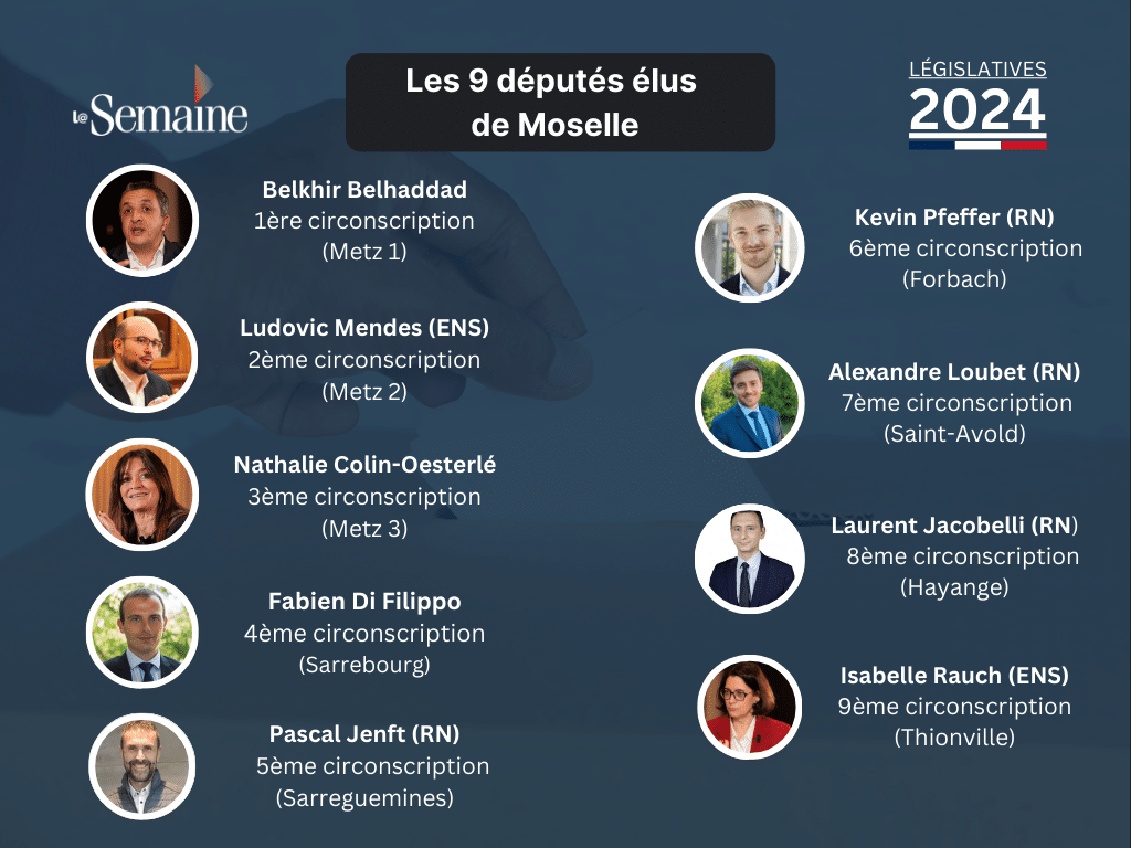 Certains pronostics en annonçaient huit. Finalement, ils ne seront que quatre élus du Rassemblement national en Moselle. Aux victoires de Kevin Pfeffer (6e, Forbach) et d’Alexandre Loubet (7e, Saint-Avold) obtenues dès le premier tour, se sont ajoutées celles de Laurent Jacobelli et Pascal Jenft. Le premier, figure du parti de Marine Le Pen, s’est imposé une nouvelle fois dans la 8e circonscription d’Hayange (54,41 %) face à l’Insoumise, Céline Léger (45,59 %). Le deuxième a pris le meilleur du député sortant LR, Vincent Seitlinger sur la 5e circonscription. Les trois élus de 2022 (Pfeffer, Loubet, Jacobelli) conservent donc leur siège auquel vient s’ajouter une seule prise de guerre : la 5e circonscription.