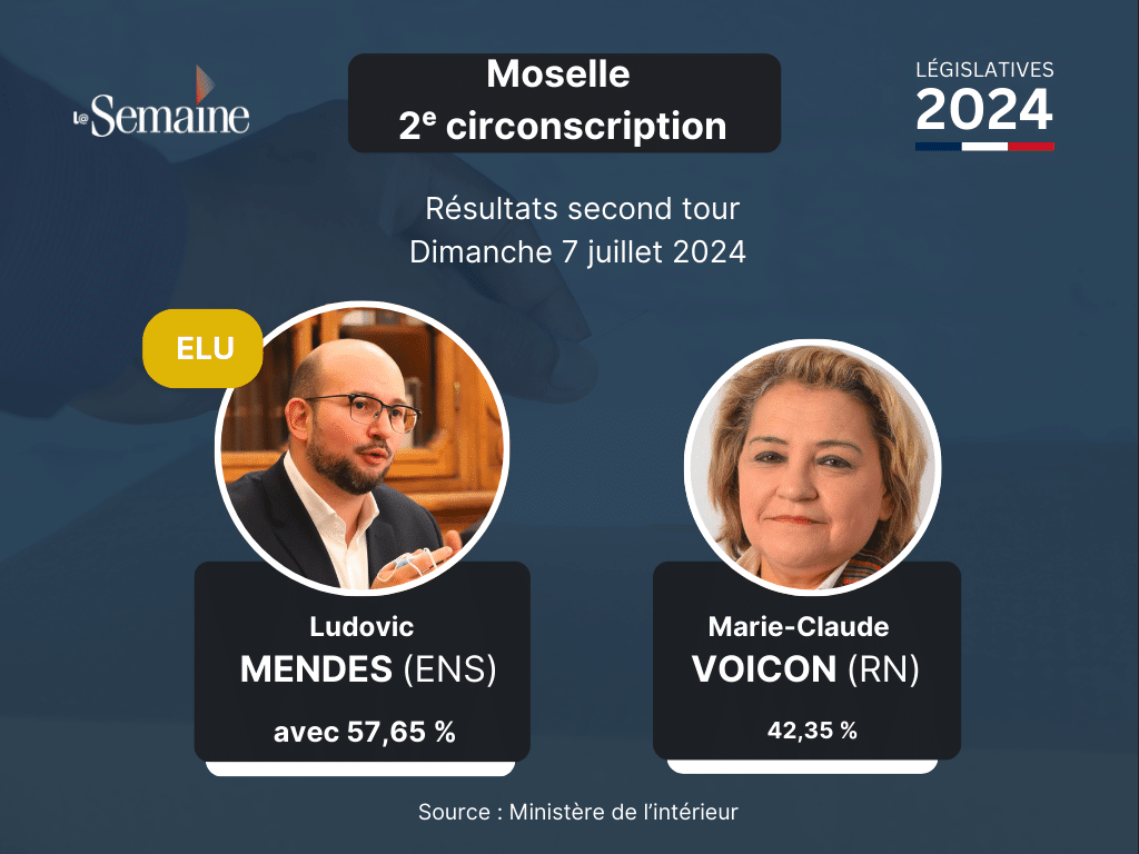 Ludovic Mendes est réélu député dans la 2e circonscription de Moselle au second tour des élections législatives, dimanche 7 juillet.Le député sortant Ludovic Mendes (Renaissance), retrouvera son siège à Paris. Le candidat de la majorité présidentielle l’emporte au second tour des législatives avec 57,65 % des suffrages exprimés contre la candidate du Rassemblement nationale, Marie-Claude Voinçon (42,35 %). Dans la 2e circonscription, le député de la désormais ex majorité présidentielle réussit son pari : en plus d’avoir bénéficier du soutien d’une large partie du spectre politique, qui a répondu présent pour mettre en place un front républicain, les électeurs semblent s’être également mobilisé dans ce même objectif. Signe qu’il a entendu ce soutien d’électeurs venant d’autres familles politiques – et qu’il prend distance, d’une certaine façon, de la macronie – le député réélu a annoncé au micro de Moselle TV qu’il siègerait vraisemblablement en tant que député apparenté Renaissance.