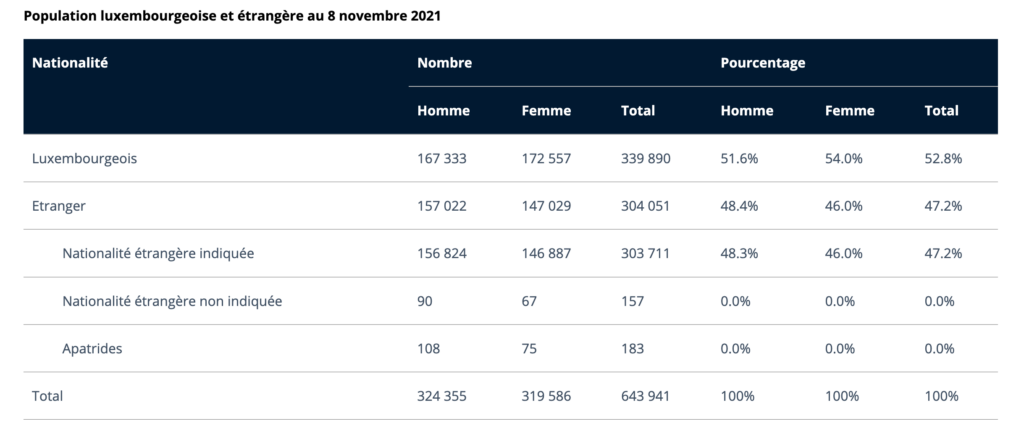 « Depuis le recensement de 2011, la population étrangère a augmenté de près de 38 % pour atteindre, au 8 novembre 2021, 304 051 personnes, représentant 47,2 % de la population totale », indique le Statec, l’institut luxembourgeois des statistiques, dans une étude dévoilée lundi 8 mai. Le Statec y présente les résultats du recensement national effectué en 2021. « L’augmentation du nombre de Luxembourgeois est beaucoup moins prononcée, note encore le Statec. Au 8 novembre 2021, on comptait 339 890 personnes ayant la nationalité luxembourgeoise », soit + 16,5 % par rapport à 2011. En conséquence, « les Luxembourgeois de naissance représentent 50, 7% de la population ». La nationalité portugaise est la première nationalité étrangère dans le pays avec 93 659 personnes, soit 14,5 % de la population totale. Suivent les Français (7,6 %), les Italiens (3,7 %), les Belges (3,1 %), les Allemands (2 %), les Espagnols (1,3 %), les Roumains (1 %) et les Polonais (0,8 %). « Les deux dernières nationalités de ce top dix sont des nationalités non-européennes : les Britanniques (0,7 %) et les Chinois (0,6 %). » Le Statec précise qu’environ 180 nationalités ont été recensées en 2021.
