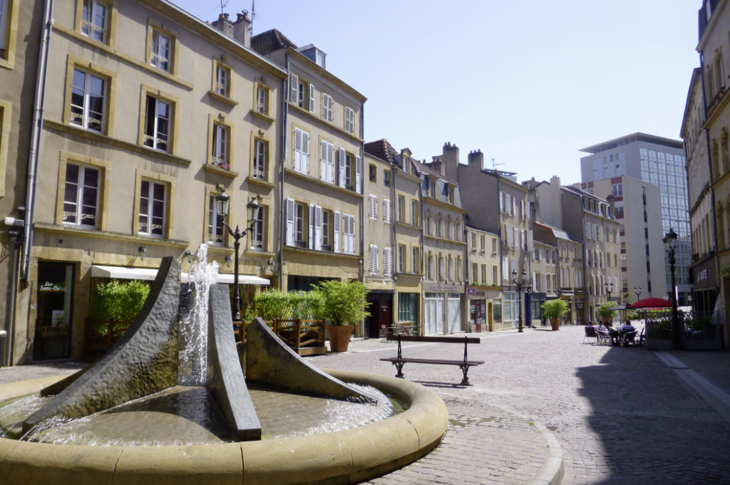 La fontaine de la place des Charrons représente une roue. Un hommage aux artisans charrier qui y vivaient et travaillaient au Moyen-Âge. Photo Creative CommonsUne semaine, une place emblématique de Metz. Cet été, la rédaction de « La Semaine » vous propose une balade ensoleillée à la découverte de ces lieux de caractère et d’histoire. Notre pérégrination nous emmène dans le quartier Outre-Seille, sur la charmante place des Charrons. Parfois réputée bruyante et mal fréquentée, elle a pourtant plus d’un atout sous le pavé pour charmer les habitants comme les touristes.