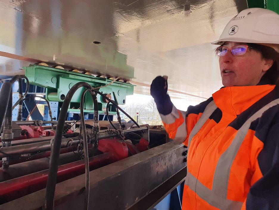 Cette cinquième phase de lançage s’étend sur cinq jours. « Nous aurions pu le faire sur une journée mais nous devons agir en fonction des créneaux de la SNCF », spécifie la technicienne. Dès lors, deux à trois heures par jour sont bloquées afin de mener à bien ces opérations. Certaines voies de circulation doivent être neutralisées et les caténaires de 25 000 volts coupés. Pour arpenter le chantier en toute sécurité, il faut aussi avoir été formé à traverser les voies de chemin de fer, connaître les règles qui différent entre la partie technifret (où l’on répare les locomotives) et celle dédiée au réseau où continuent de circuler TGV, TER, et savoir lire les codes sur le terrain. Des drapeaux rouges de part et d’autre d’une voie, c’est le signe attestant qu’aucun train ne peut y circuler. Alors, on traverse.